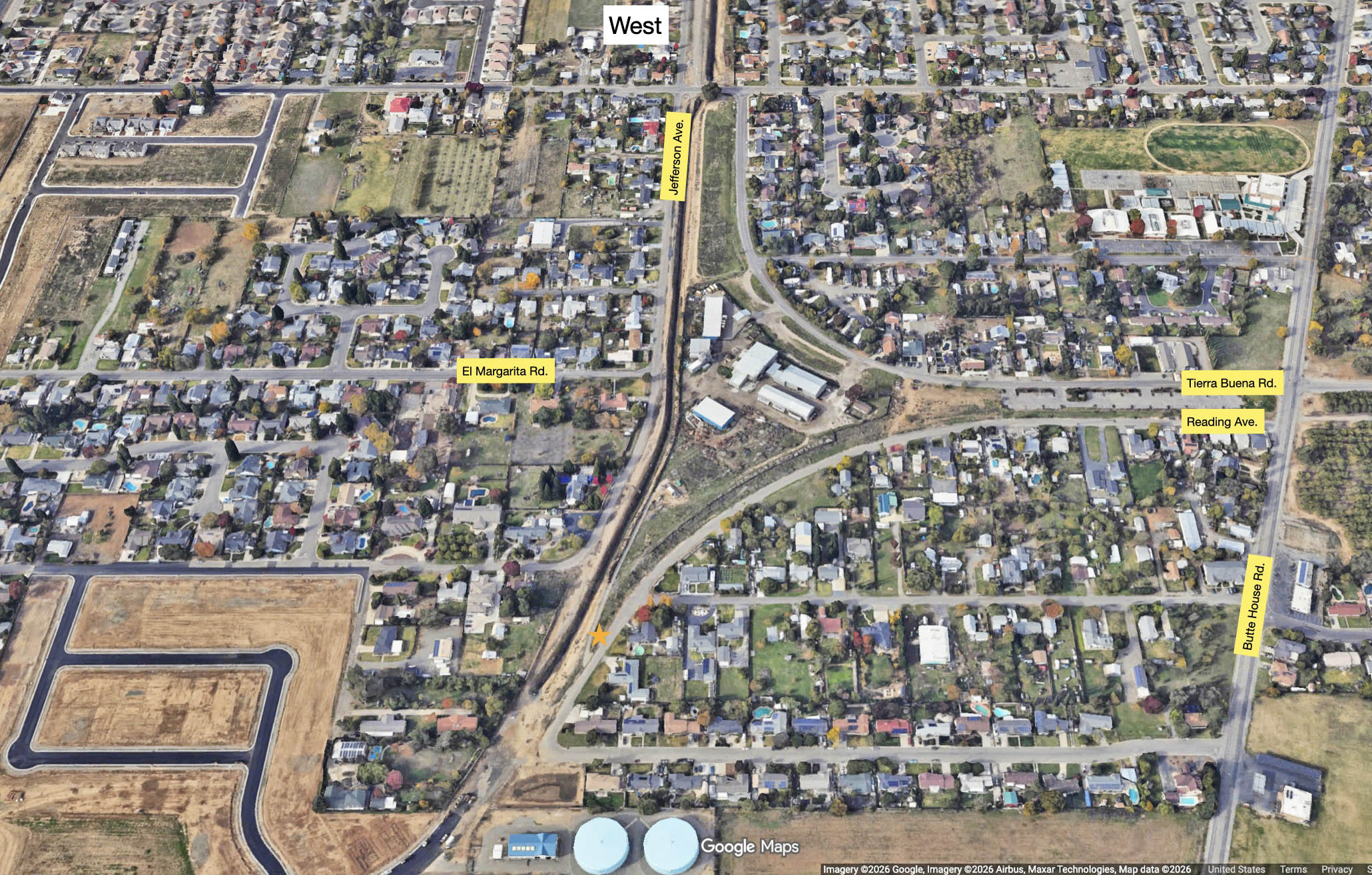 A west view above Colusa Jct. in 2026 reveals the scars of the former wye track arrangement of the Sacramento Northern Railway, SN, that sent the mainline north and the Colusa Branch line to the west. This update will attempt to recreate a ride as a passenger between Colusa Jct. to Colusa in 1940. Details of a ride from Arbee through the town of Colusa in 1940 is covered elsewhere and can be accessed by clicking here.