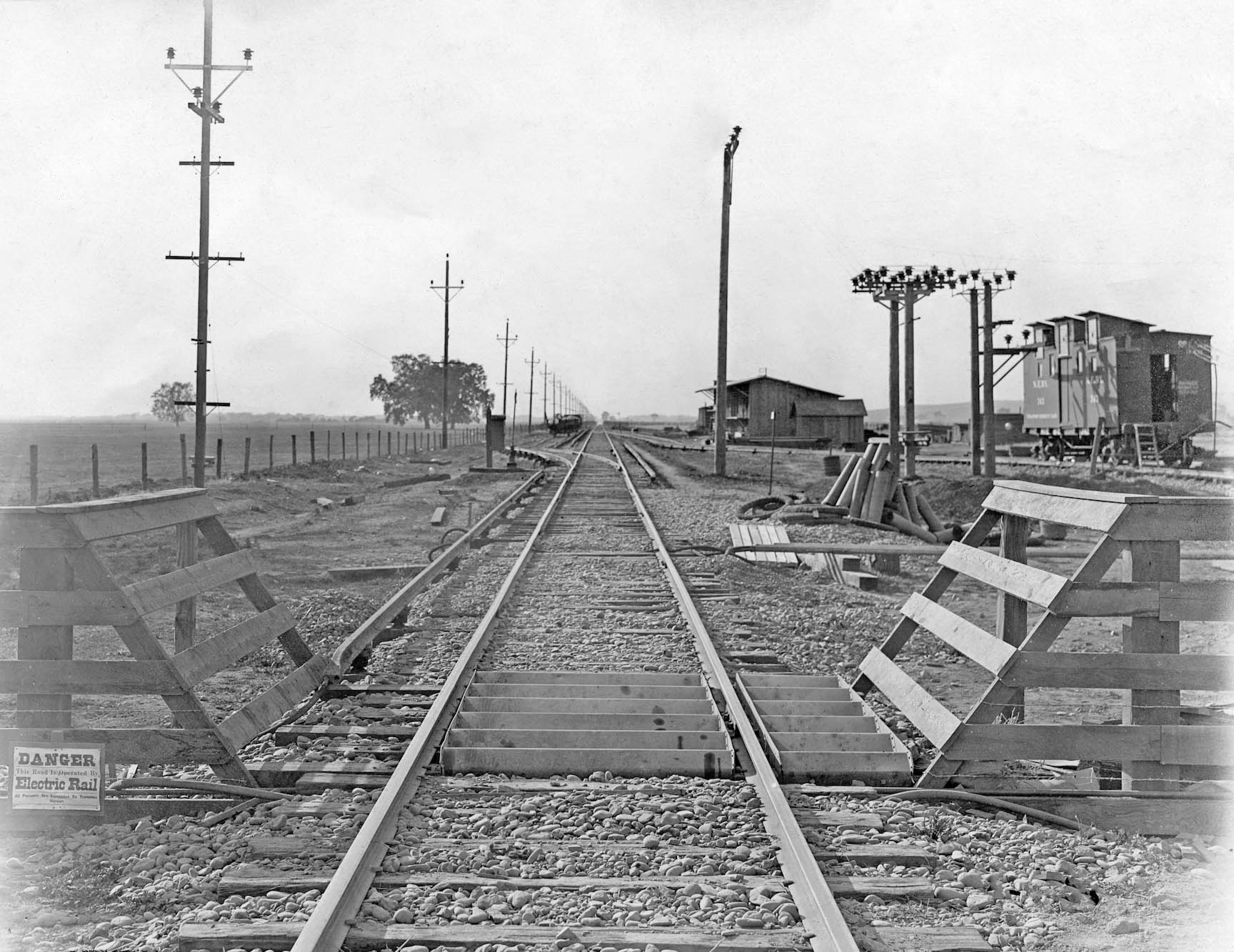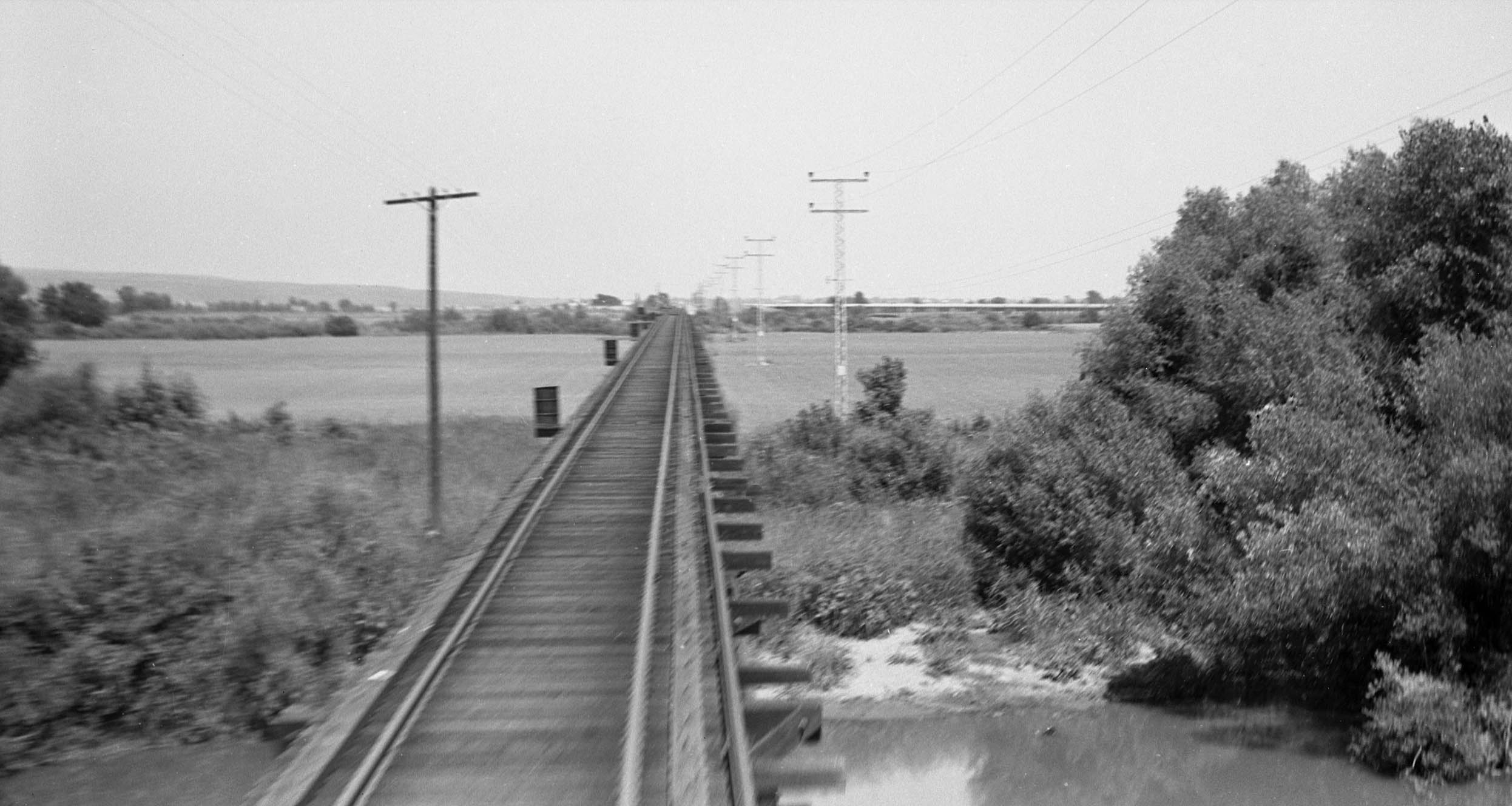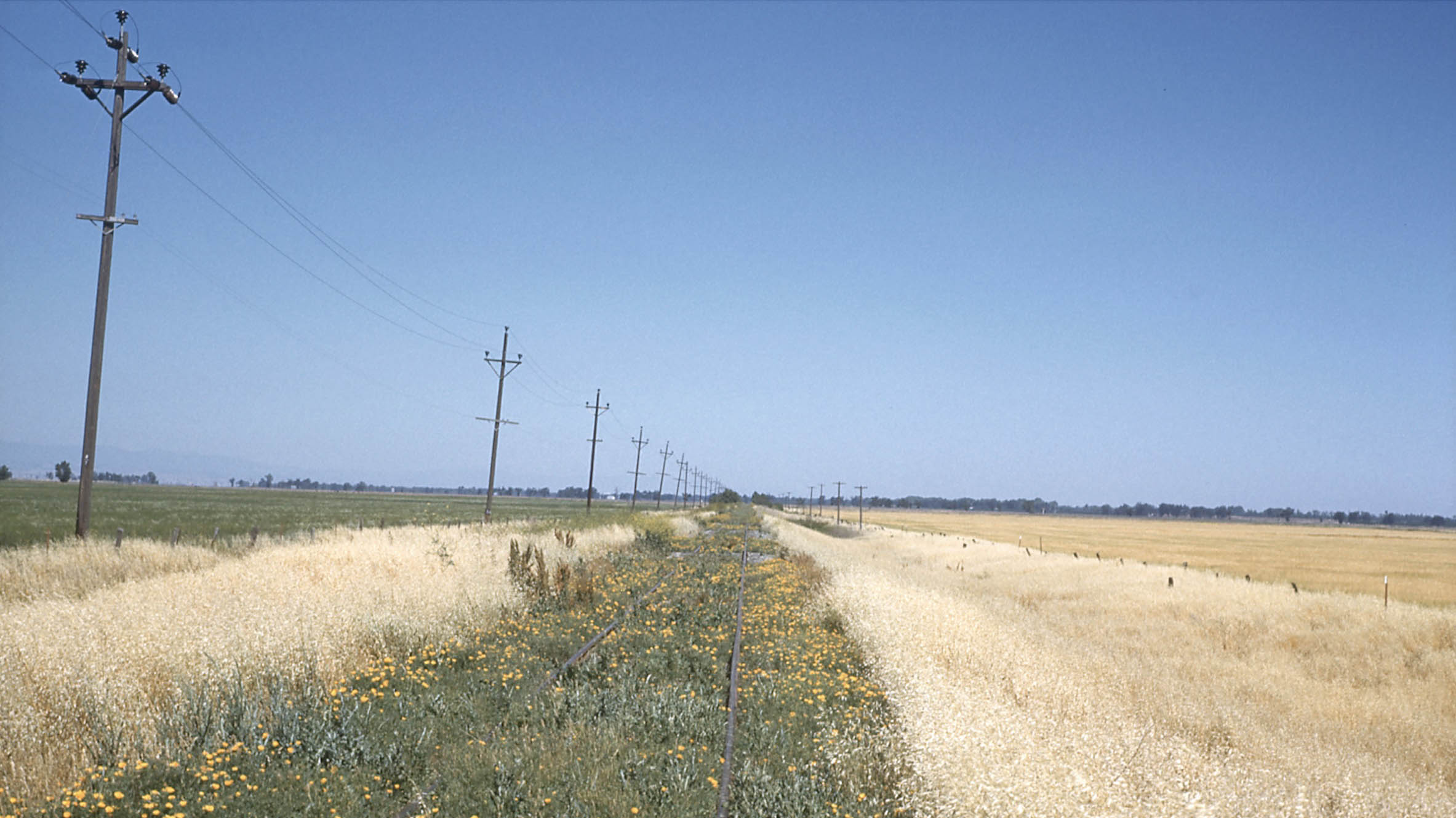 Howard Wolfe turned his camera around to get this west view still in the Farmlan-Beet Spur area showing more fresh ballast, a series of bare poles along the north side of the track, and the Meridian Bridge and electrical towers coming into view. The function of the poles is not known, and their timing is not known relative to the flood repair. A series of poles like this were in position across from the East Gridley substation. To see that arrangement, click here, and go to image 26 of the update.