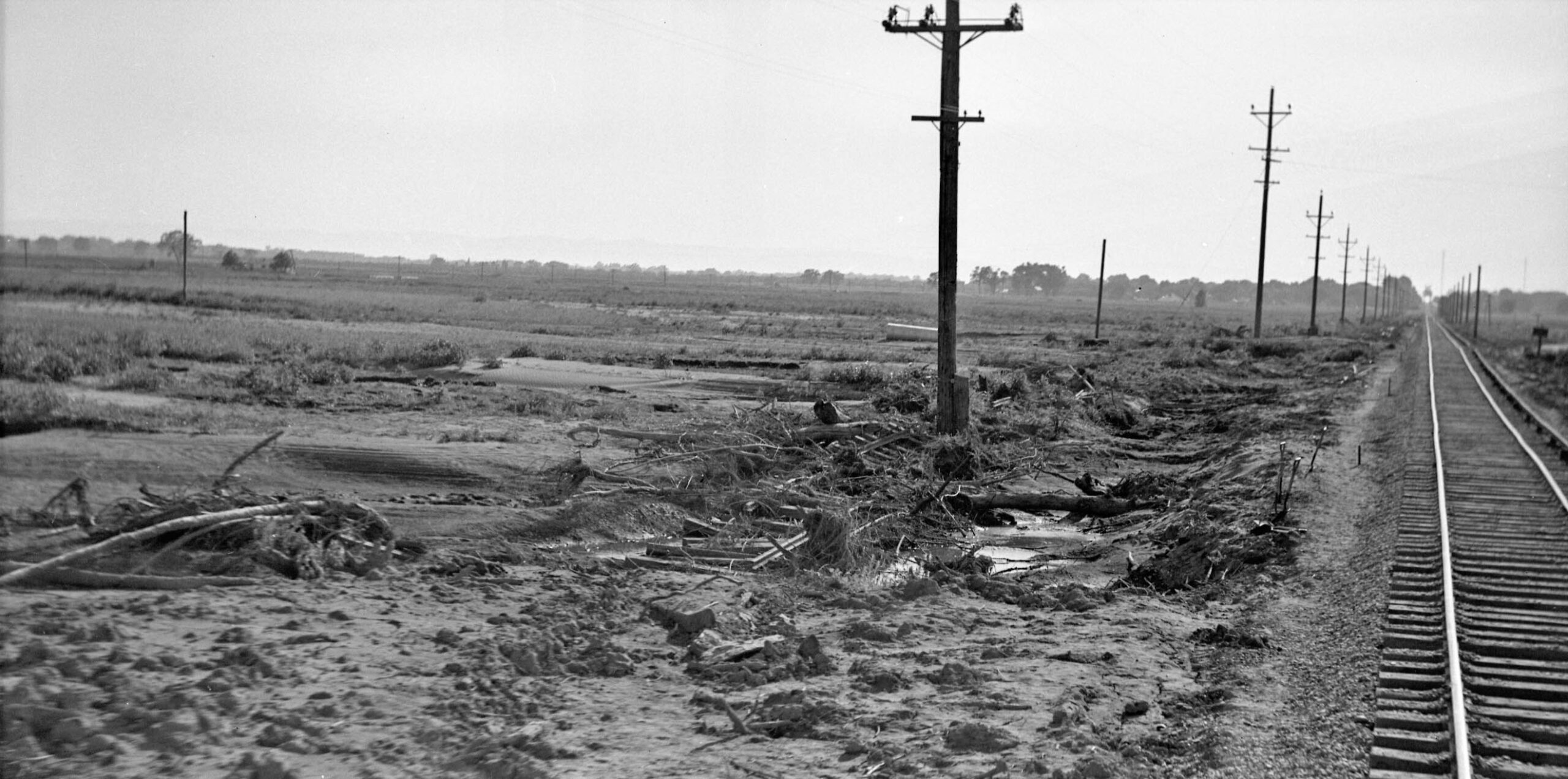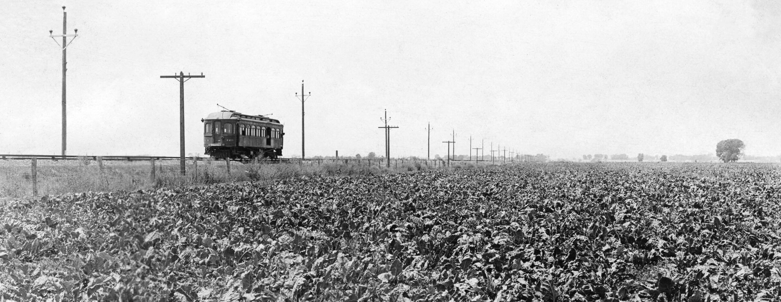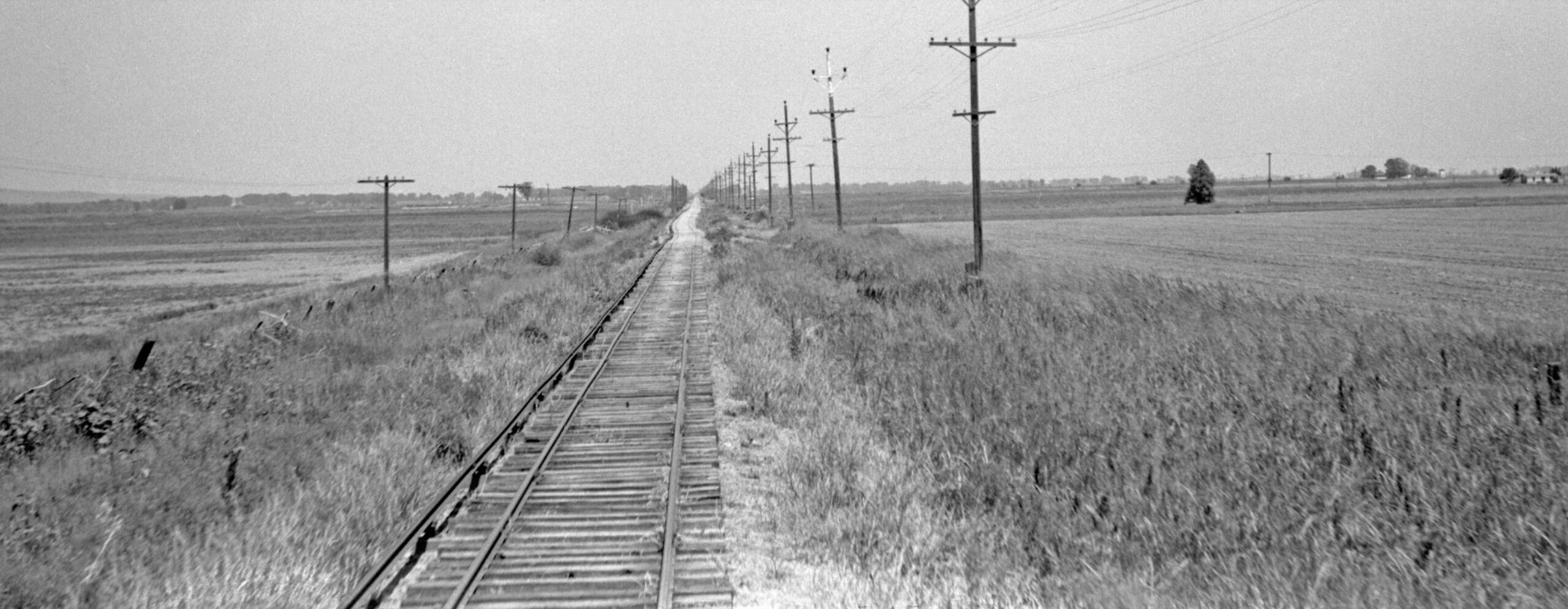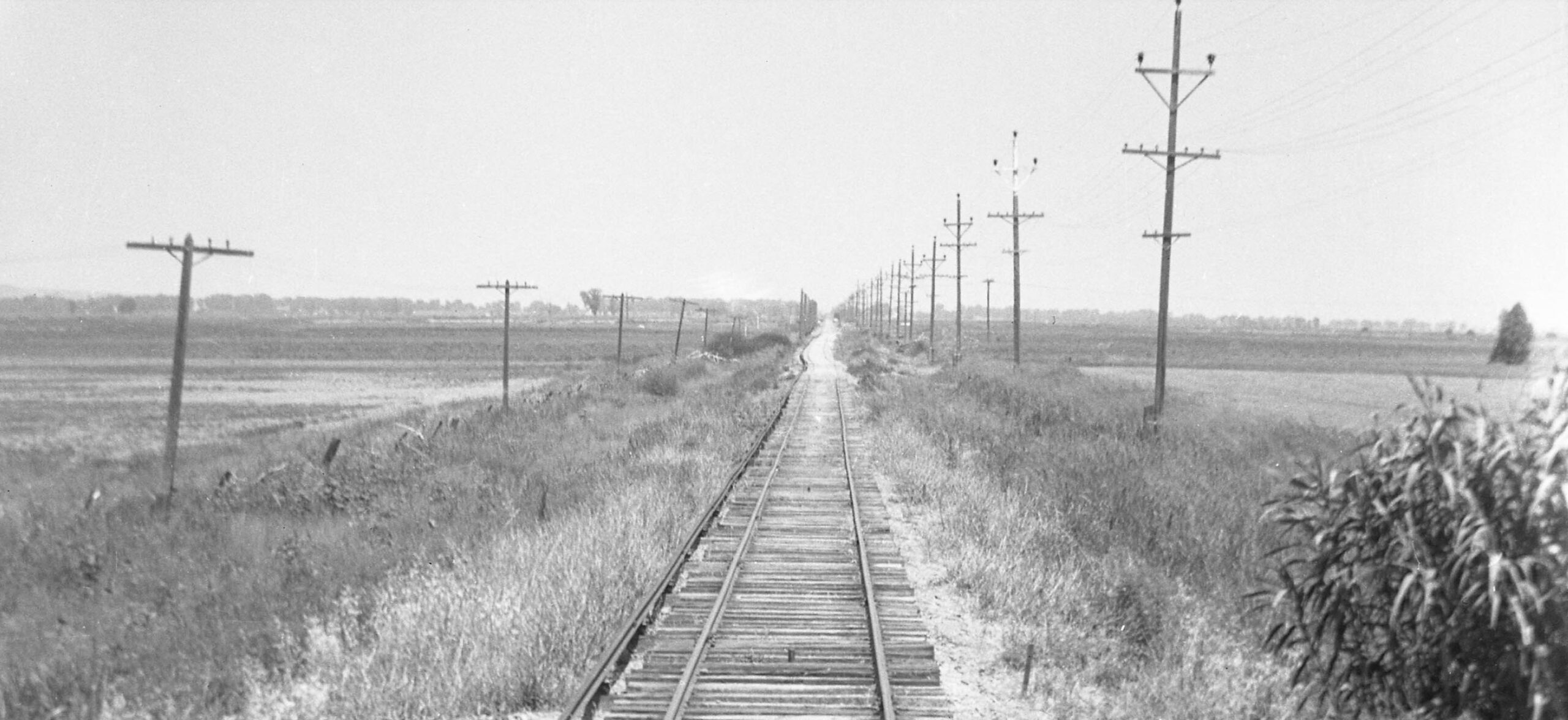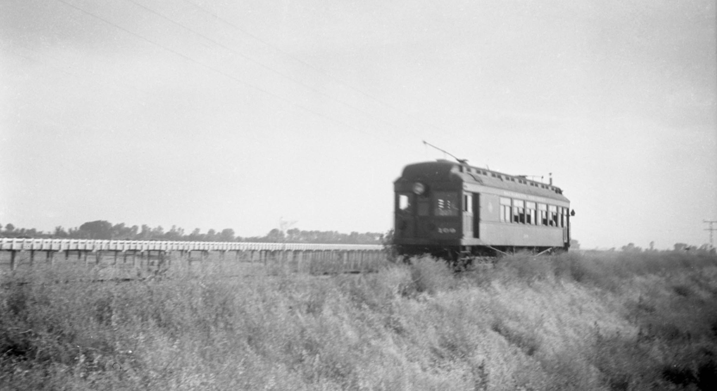 Not to overlook the previous image on the left, this detail from the branch line was taken between Meridian and Farmlan or Beet Spur, a line of boxcars on its southerly siding seen as a pinpoint in the distance. The pole and third rail positions indicate an east view. It also has to be 1940. The flood occurred earlier that year and passenger service ended at the end of Oct., so the presence of new ballast added to repair the track is the clue as to the date. The function of the row of poles seen in the distance has not been determined.