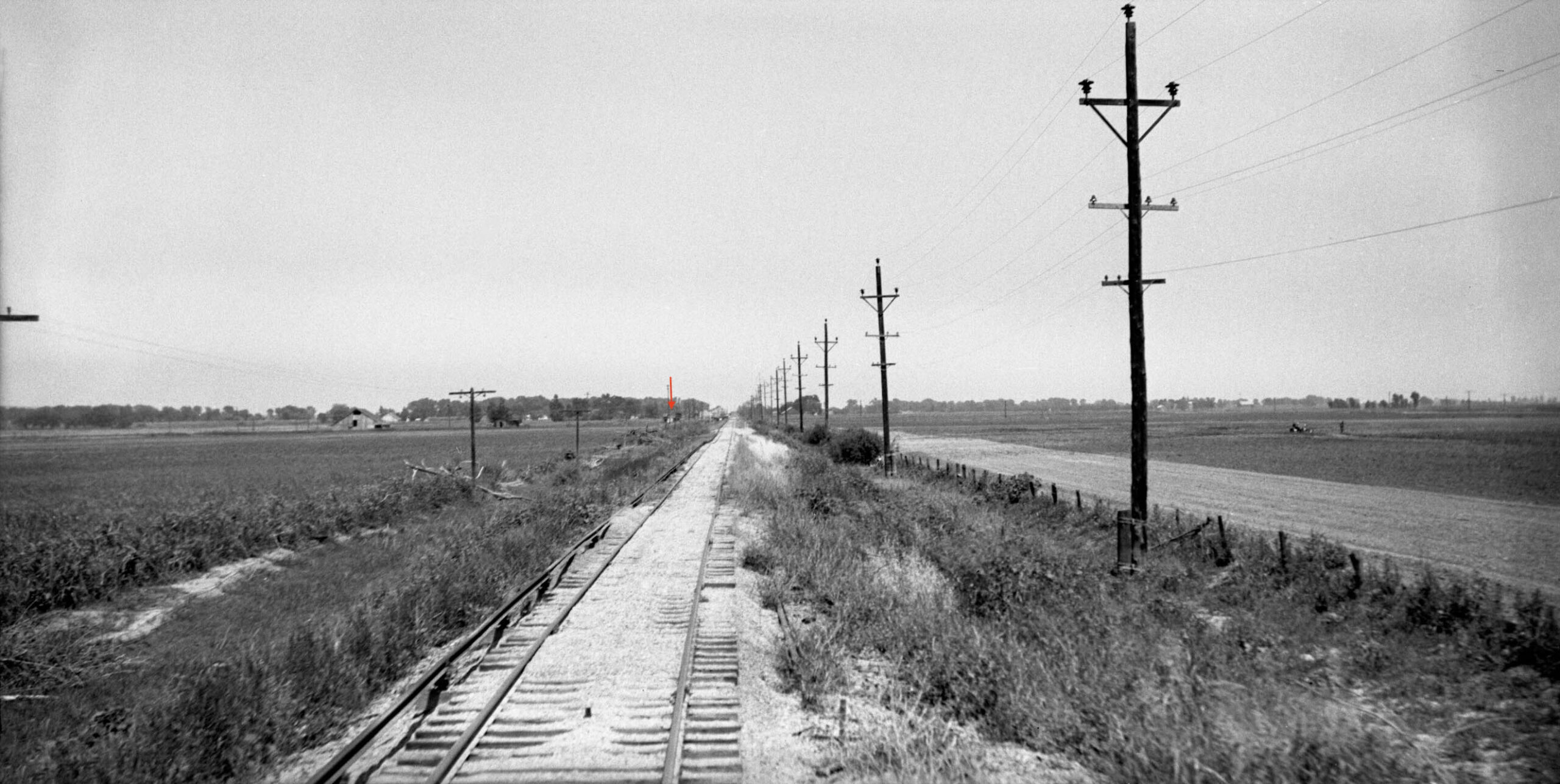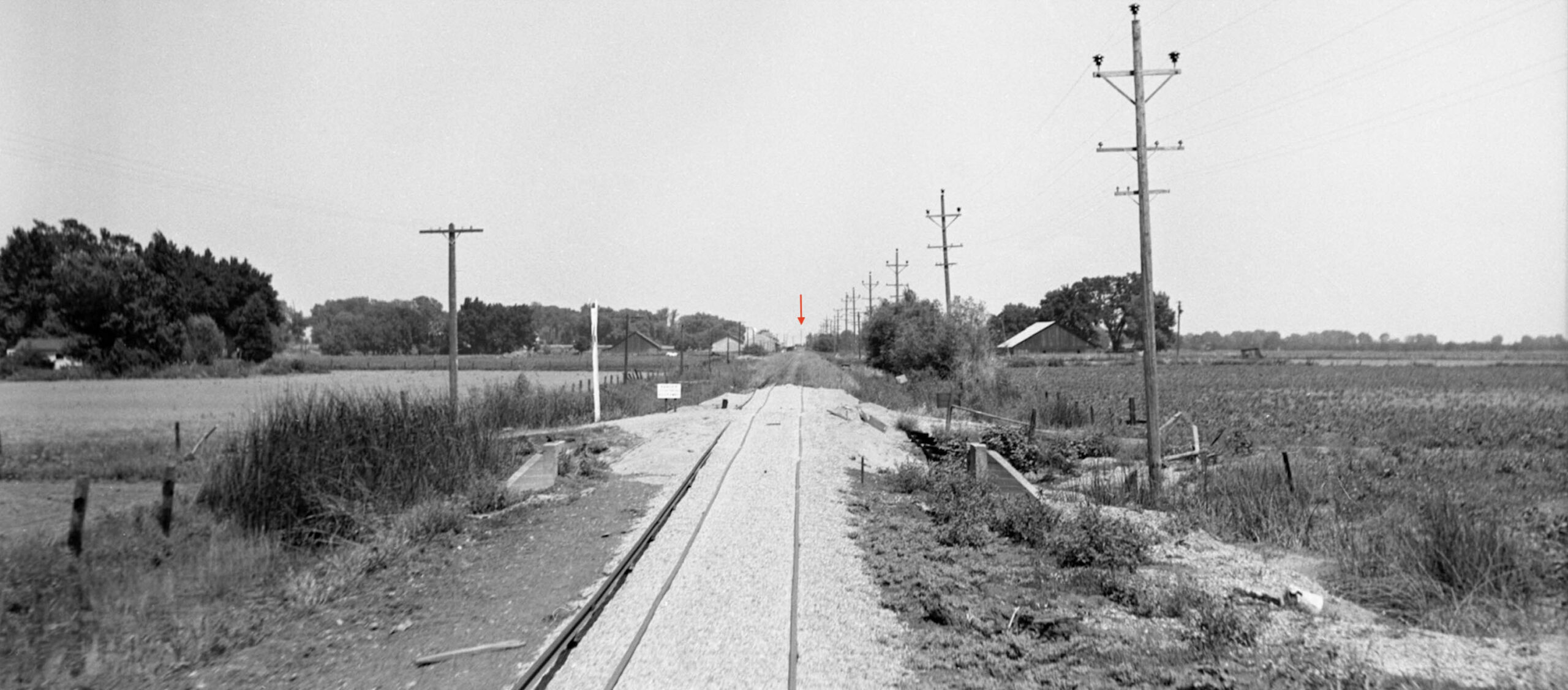 Howard Wolfe proceeded to construct overlapping east views for the entire line from Tarke all the way to Sycamore during the June 16, 1940 excursion. This first east view is east of Lira looking toward Tarke. The red arrow points to the very tall electrical pole seen in the last image. The fresh ballast in the foreground documents the repair work due to the flood of 1940 that wiped out Lira and Farmlan.