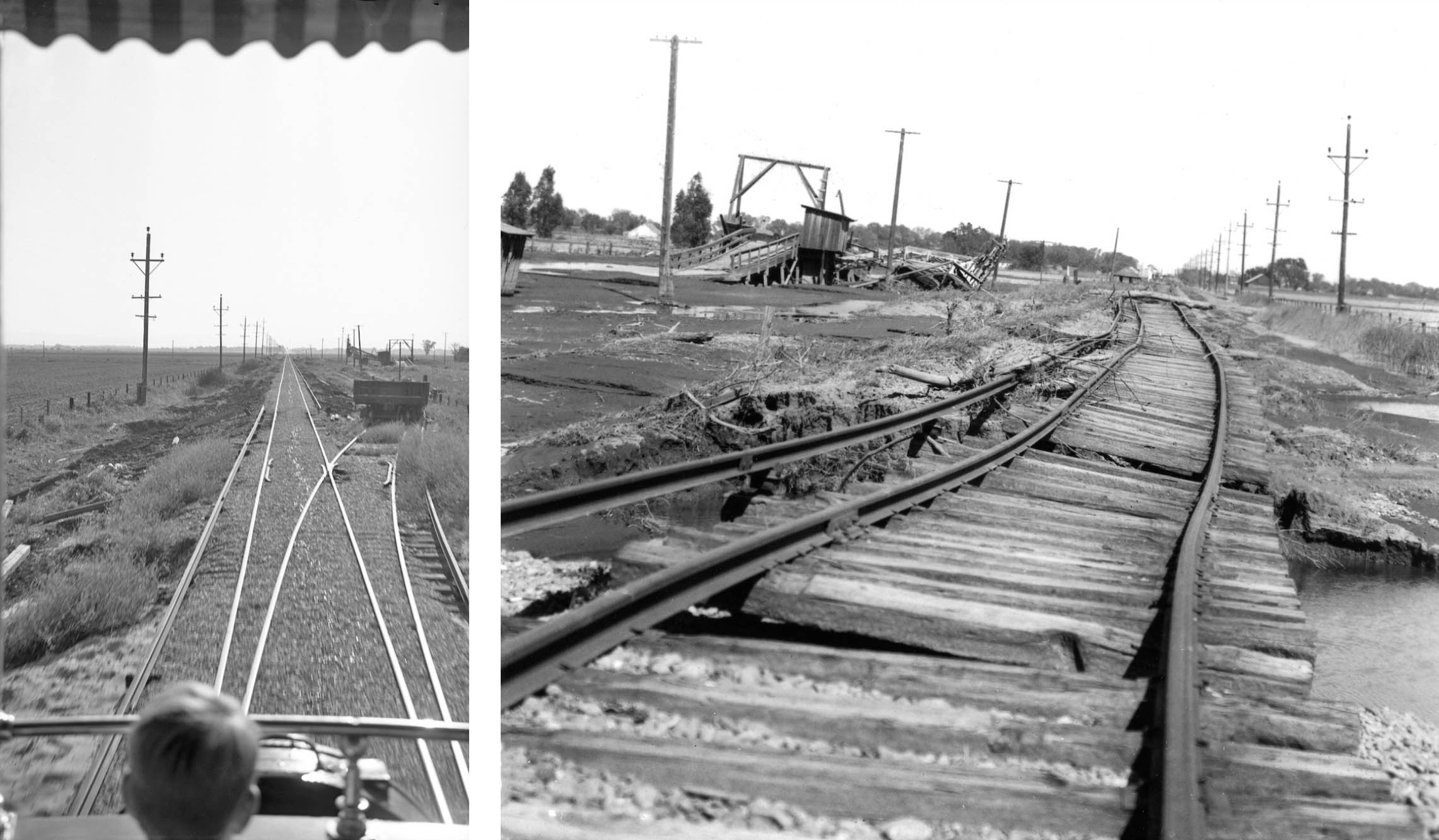 repeat of a west view from June 16, 1940 showing the Lira spur, the agricultural equipment, and the new ballast, left, and the aftermath of the flood 1940, right, an east view from Apr. 20, 1940, with Tarke in the distance.