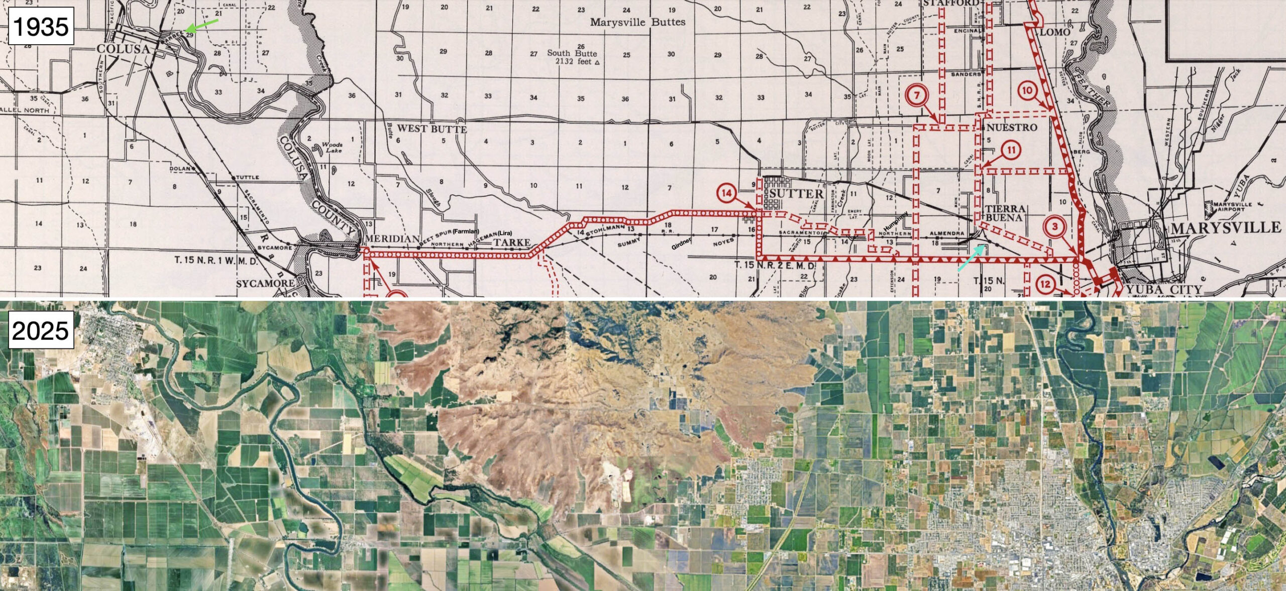 The map for 1935 shown above the one from 2025 shows the starting point at Colusa Jct., turquoise arrow, until reaching Arbee, green arrow, near the Colusa city limit. After leaving the wye at Colusa Jct., the right-of-way made only two curves before reaching Meridian, the curve to the south leading to a large overpass of the Butte Slough-Sutter Bypass, followed by a curve to the north to Tarke. From that point, a straight section with a view of the Meridian Bridge that could be seen for miles. The big curves were reserved for the last portion in Colusa County.