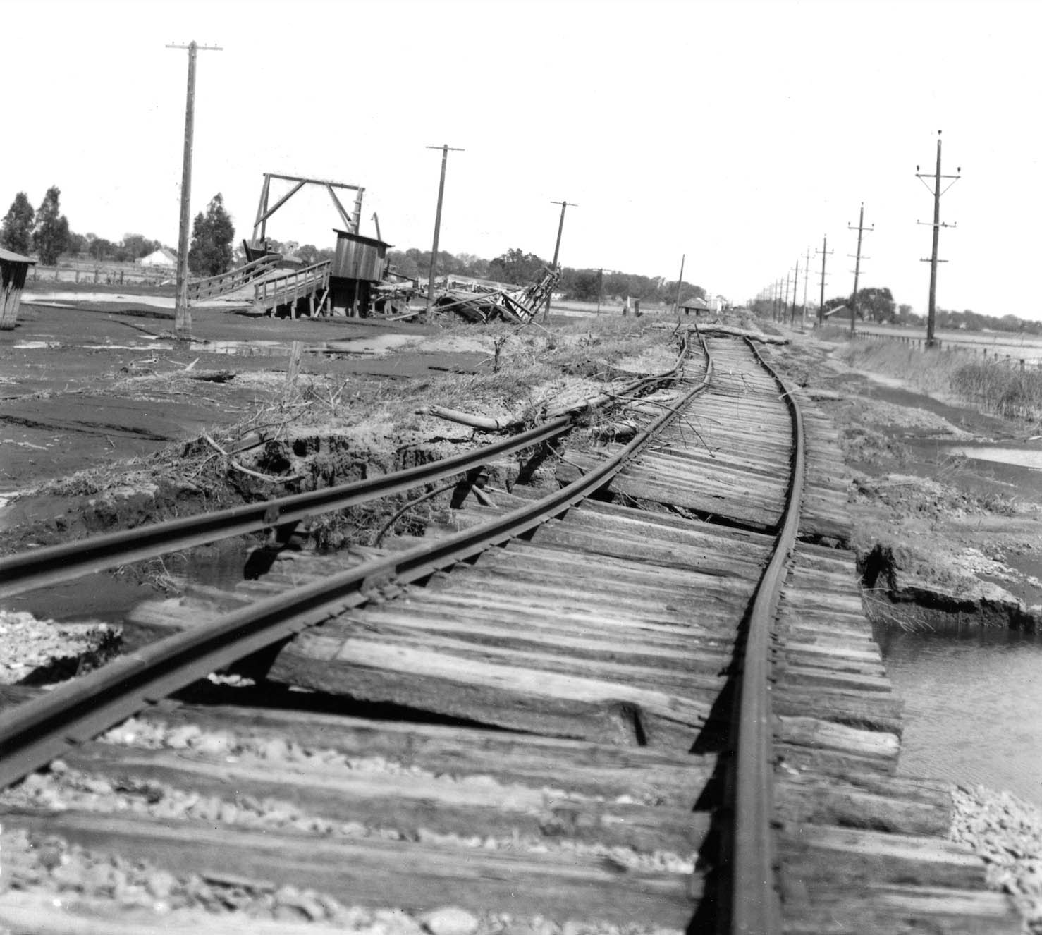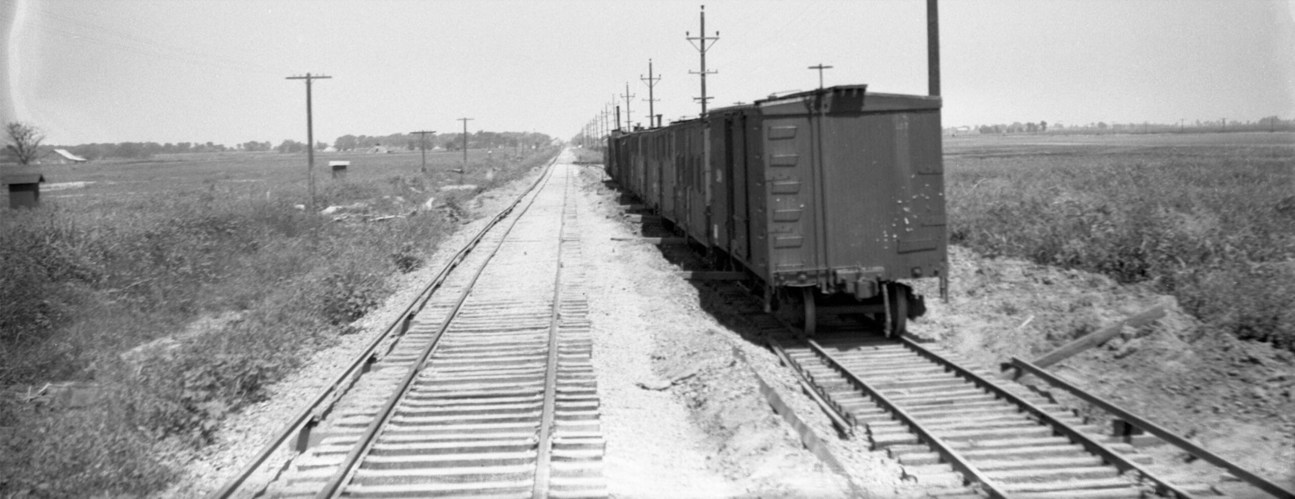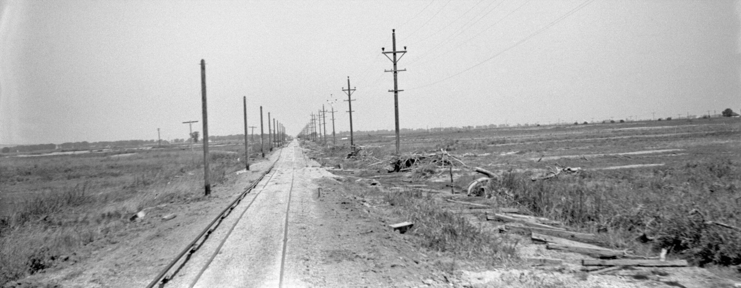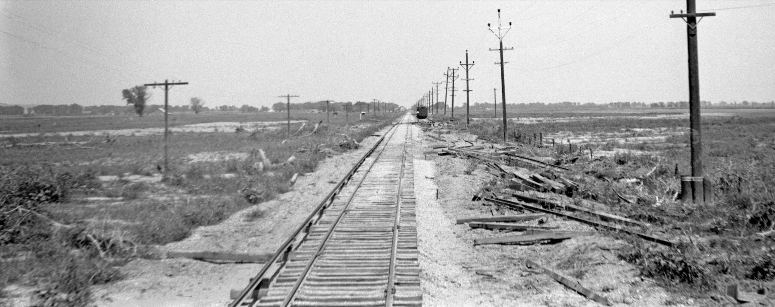 Further west and getting close to Meridian, another east view from June 16, 1940, now showing the poles in the distance. The placement of new ballast may be appreciated in the distance, a place where a small kink was placed in the right-of-way, function or timing relative to the flood repair unknown.