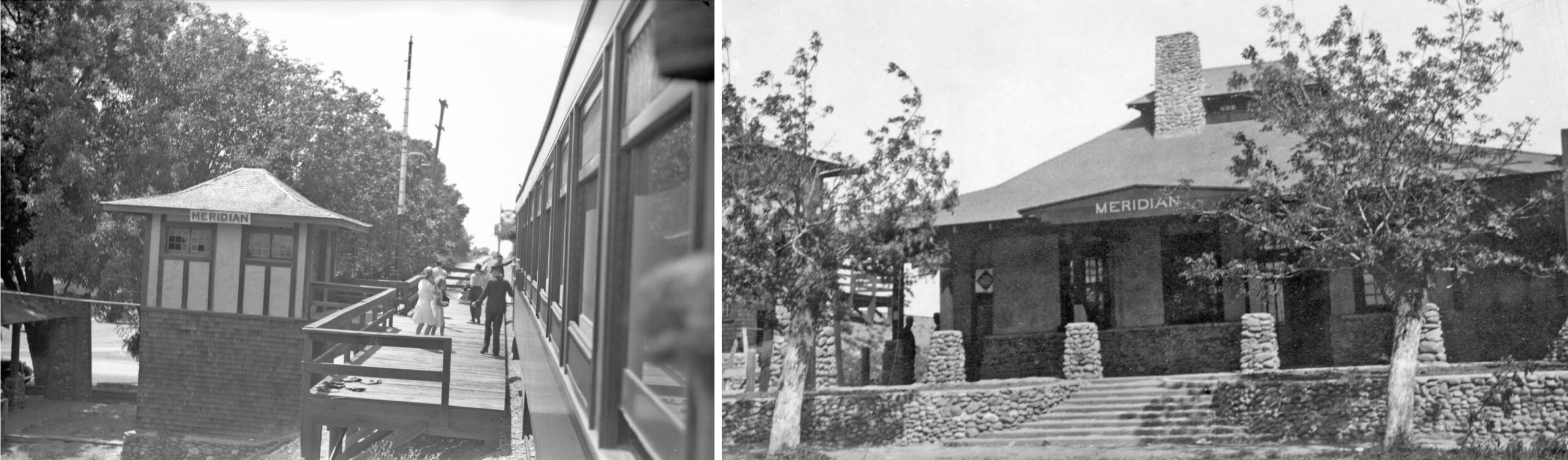 Approaching the Meridian station platform on June 16, 1940, left, the design of the elevator tower follows Northern Electric general manager A. D. Schindler’s rock pylon Craftsman design of the depot building seen in 1940, right. The broken windows in the tower reflect its neglect and placement out of service in 1936. The depot building was based on Schindler’s design of the Pacific Electric Railway’s Glendale, CA station. The building in Meridian is the only one of four built that survives into 2026. Meridian is covered in depth in another update, click here.