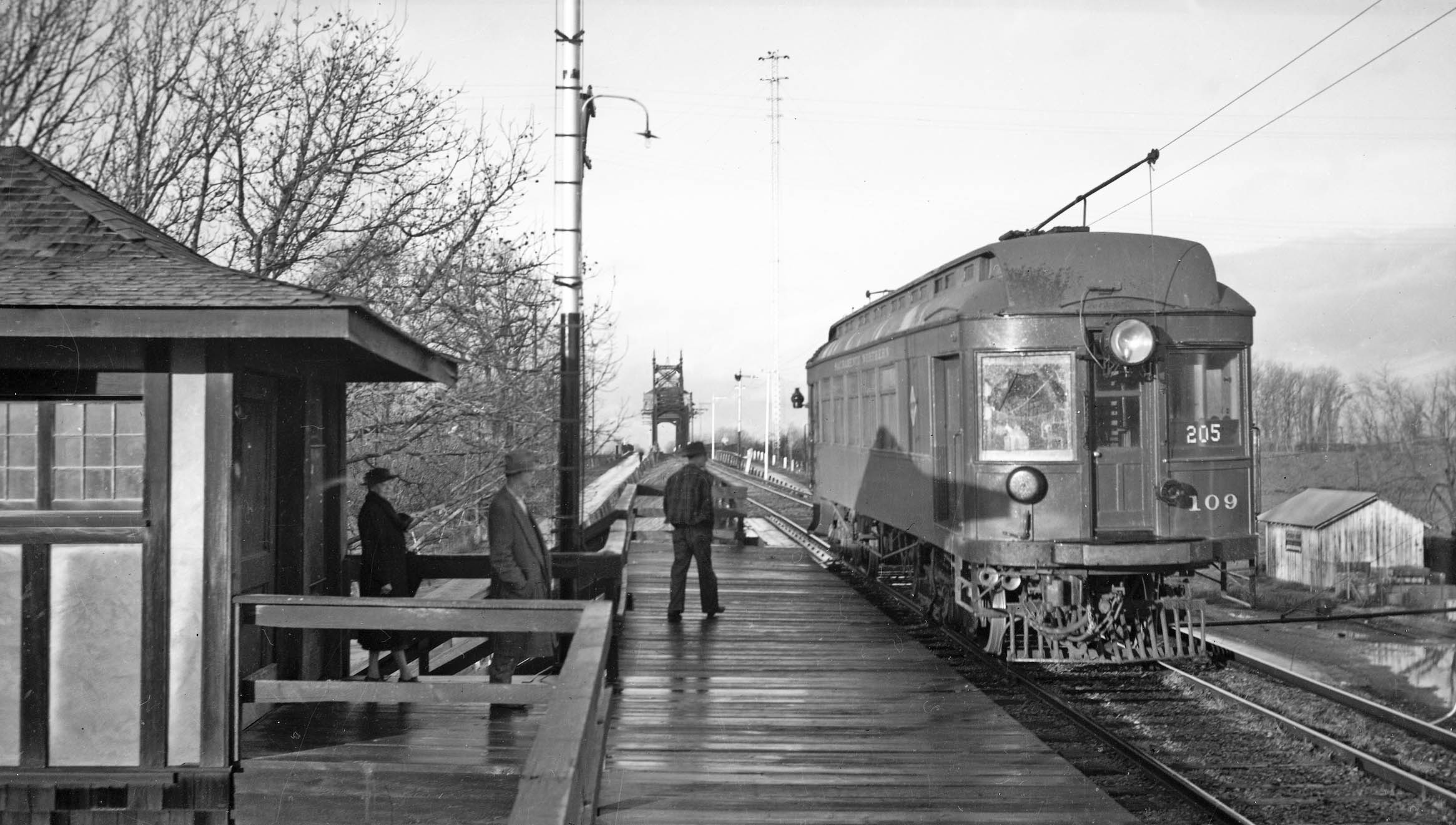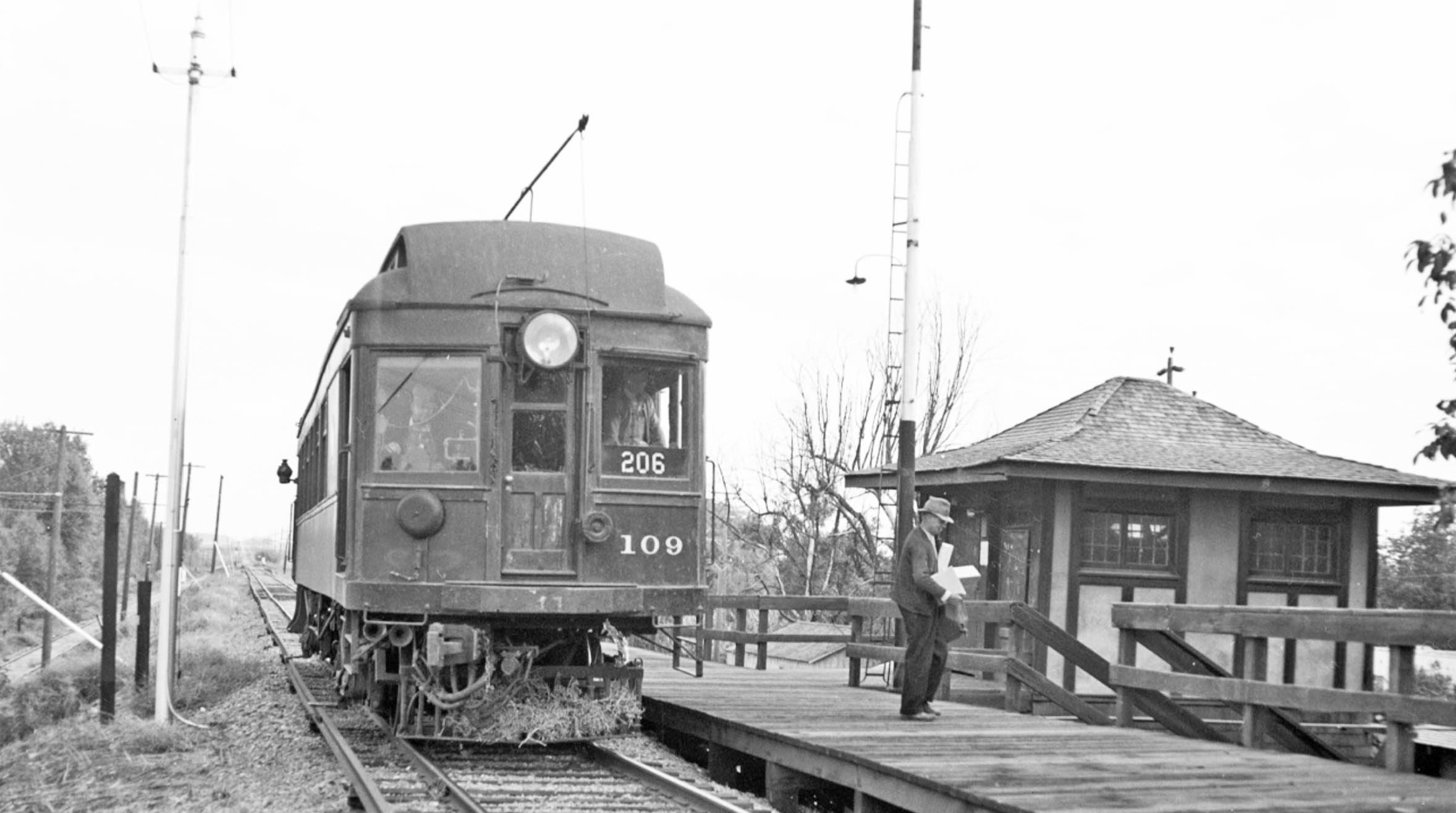 Meanwhile, SN 109 waits at the passenger platform in this east view from 1940 having discharged one passenger who is heading for the open-air stairway to the right or west of the tower.