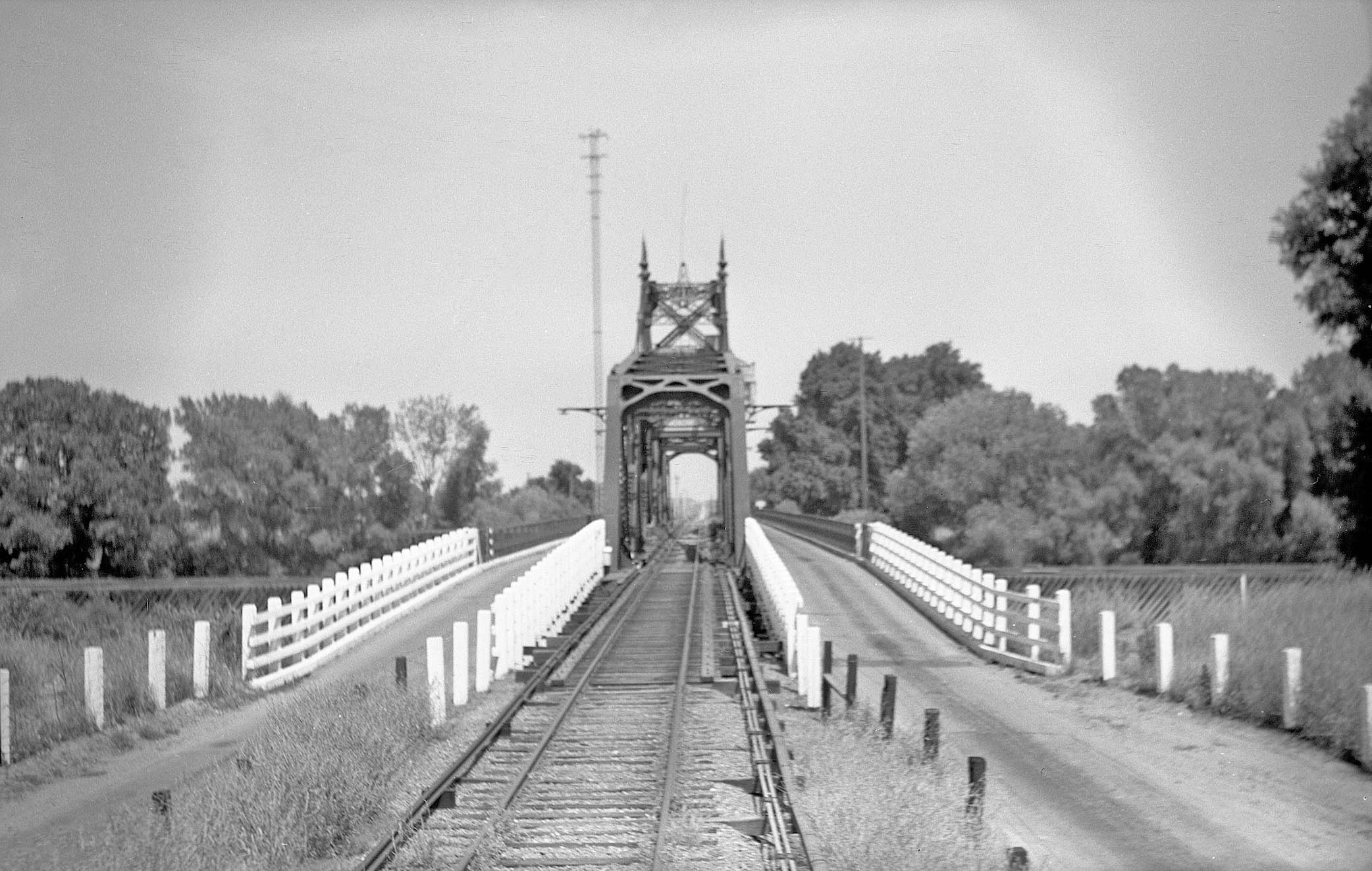 The excursion train of June 16, 1940 is over the west tributary of Butte Slough with an east view of the wooden trestle portion of the Butte Slough-Sutter Bypass Overpass, herein the slough or overpass. The section north of the overpass is generally referred to as Butte Slough, while the section to the south the more engineered Sutter Bypass set up to handle flooding from the Sacramento River. At the Butte Slough Outfall gates near Colusa, Butte Creek flow can be either directed into the Sacramento River, regulated to accommodate agricultural demands, or continued to wildlife areas supplied by the Sutter Bypass. Minus floods, the flow enters the Sacramento River near the mouth of the Feather River at Verona. Click here for more.