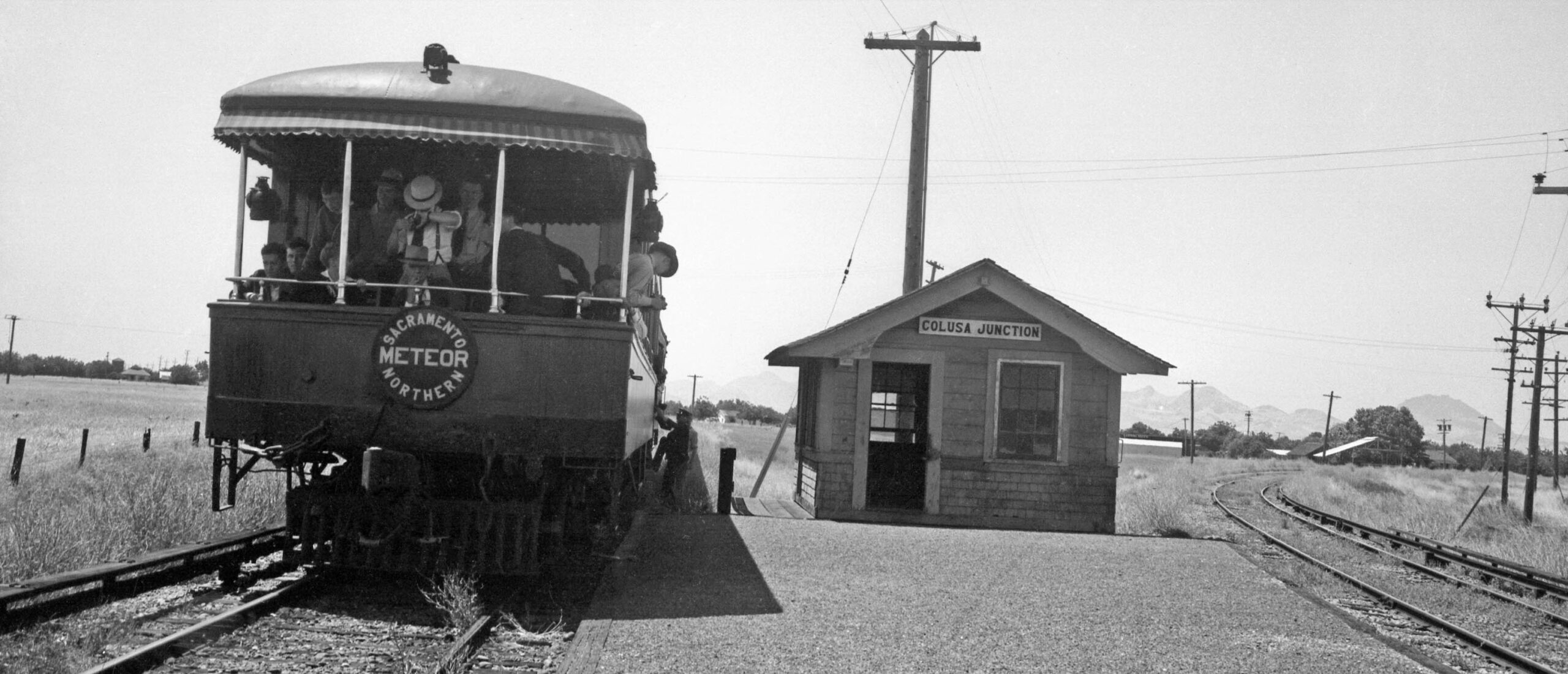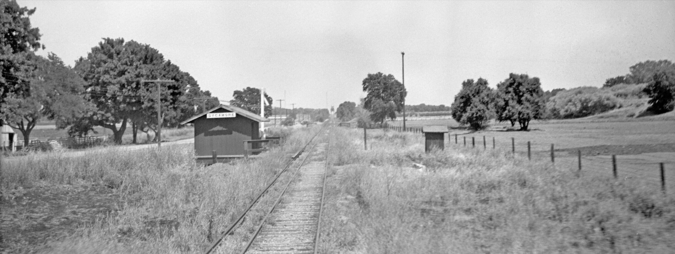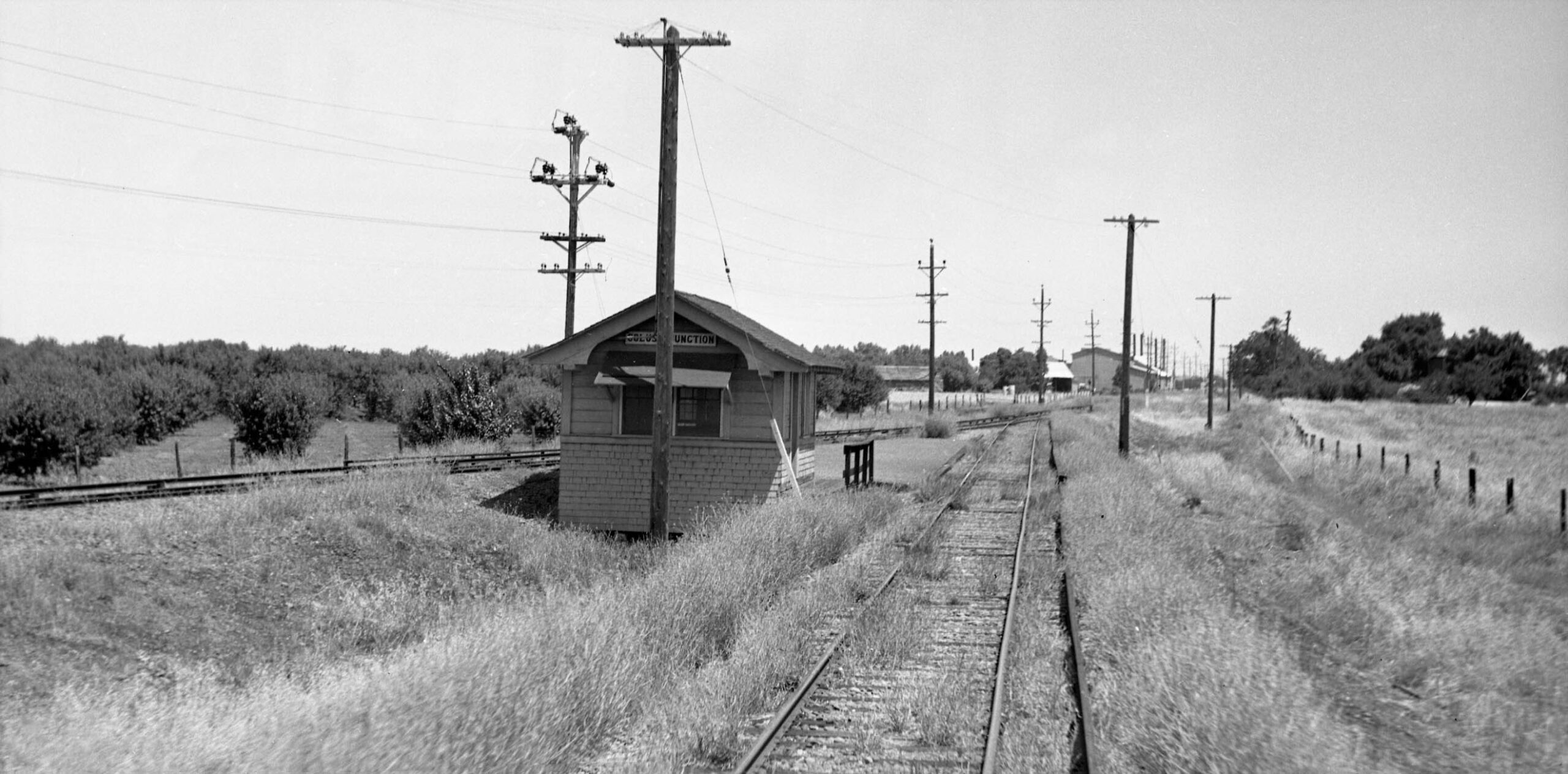 Possibly the most important photo taken by Howard Wolfe on the 1940 excursion was this east view of the station shelter at Sycamore. This is the only image found between the Meridian Bridge and the Colusa city limit. In addition, “Sutter-type” electrical transmission poles are no where to be seen, but the view of the bridge and the shelter define the area. This eliminates a way to identify any other possible images of the SN in Colusa County east of the City of Colusa once the railway turned north to eliminate the view of the bridge. Wolfe did not take any other overlapping images on his trip to Colusa.