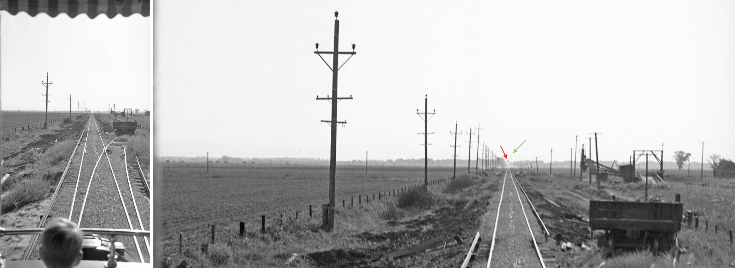 On the left is a view Dudley Thickens took from parlor car Sacramento on the excursion of June 6, 1940. On the right, a detail showing the Meridian Bridge, red arrow, and adjacent electrical power tower, green arrow, indicating the view is to the west. For the Colusa Branch in Sutter County, the electrical poles were always to the south of the rail after leaving the wye area, the third rail always to the north, except for a short distance where a spur or siding came off to the north. Rare landmarks, the agricultural equipment and spur position mark this place as Lira.