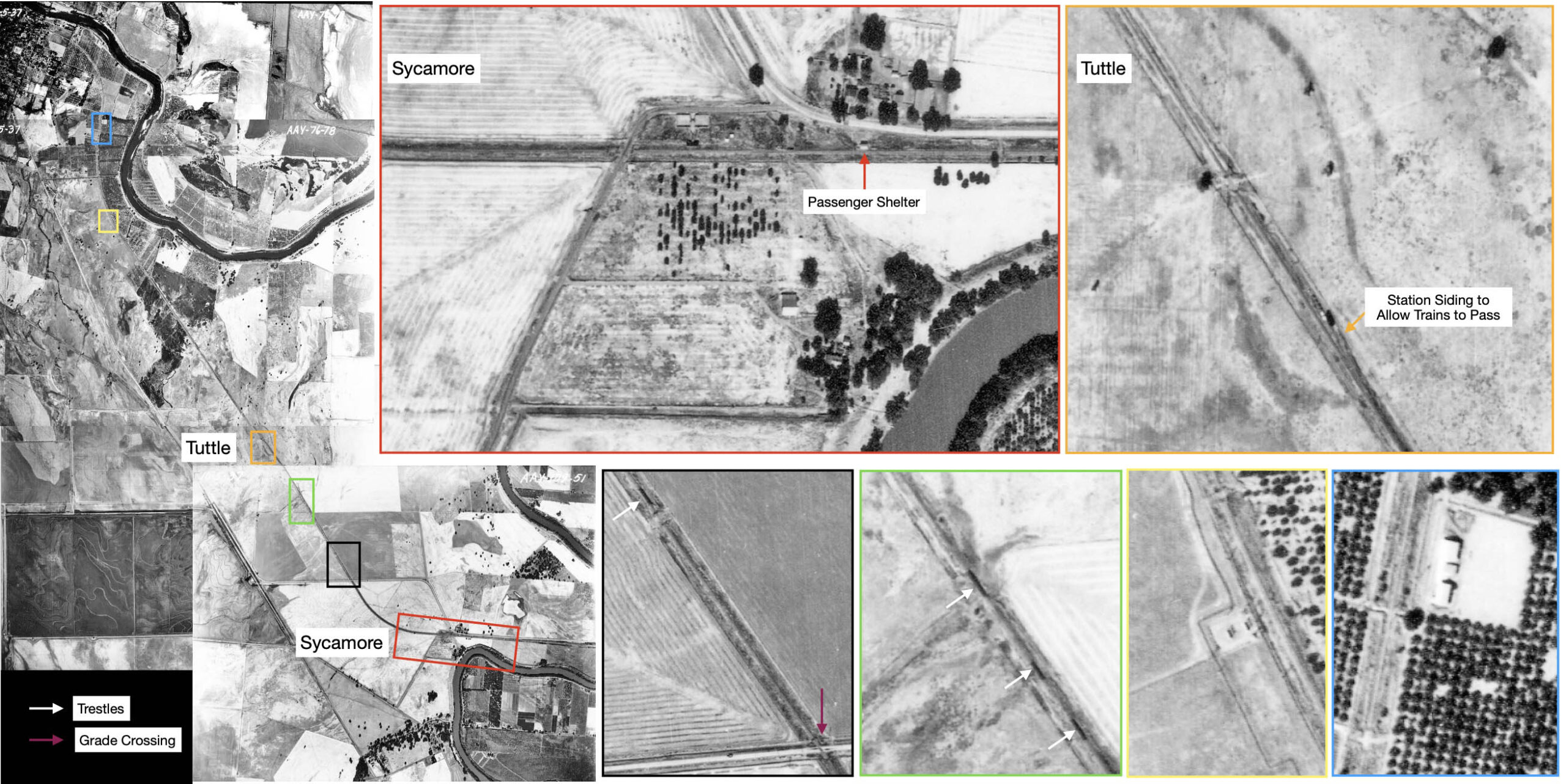 To help locate images from ca. 1940 in Colusa County, this collage of aerials from 1937 on the left was constructed to show the entire branch line from the Sycamore area, red box, to Colusa. Structural features are color coordinated to allow identification. The single grade crossing, purple arrow, would be Steidlmayer Rd. in 2026. A possible siding at Tuttle had been designated as the place for trains heading in opposite directions to pass twice a day when ten trains a day ran in 1929, but unnecessary when only six trains a day ran in 1939. The placement of a siding for Sycamore was not obvious.