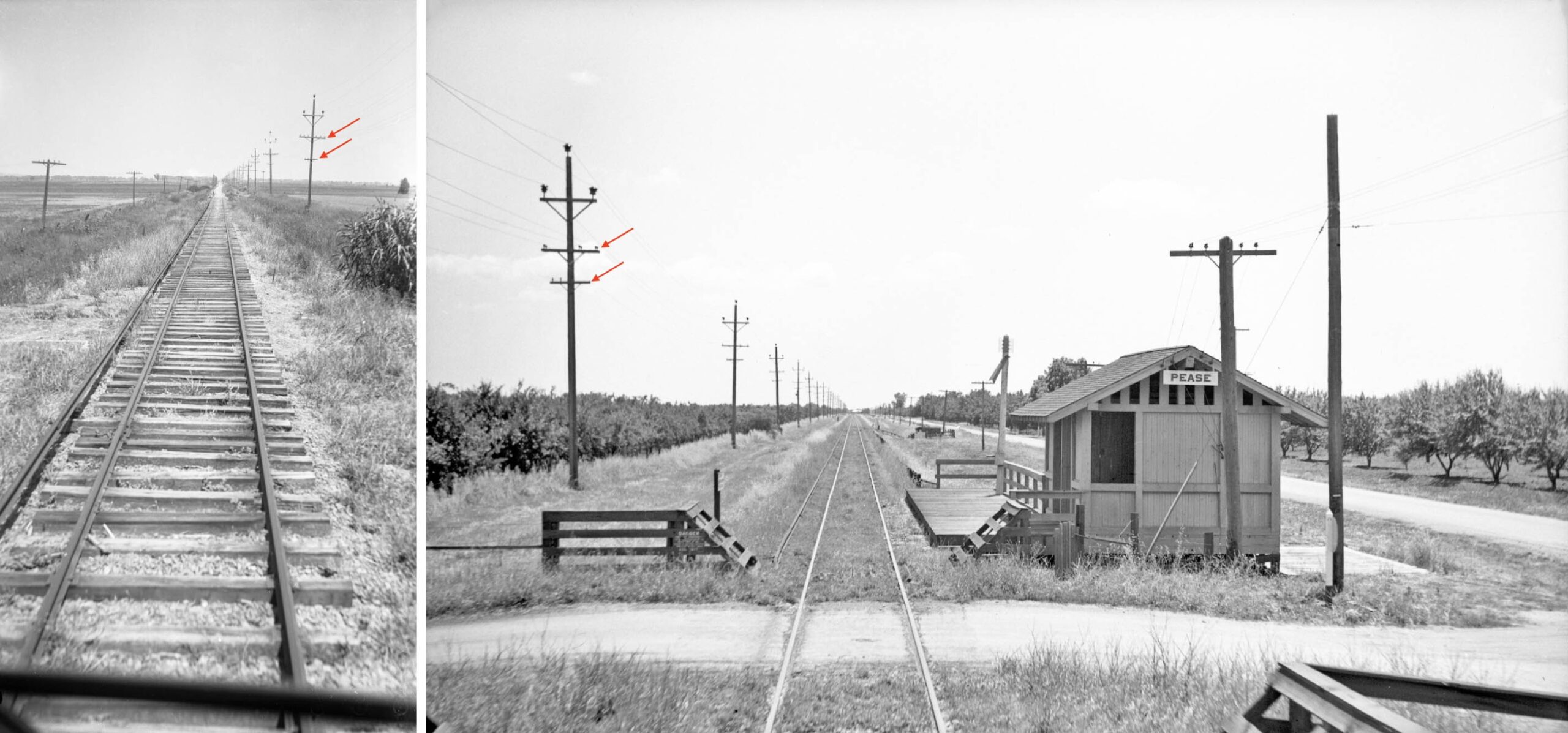 In contrast to the Colusa Branch, left, tracks in Sutter County from the Ardmore substation to south of Saunders on the mainline had electrical poles alongside the third rail to the east of the track, the example here at Pease, right, a south view from June 2, 1940. The tripartite structure at the top of the poles was also used north of Del Paso in Sacramento County, and in the first part of southern-most Yuba County, but those poles lacked the secondary wire holders, red arrows. A cluster of poles like the ones in Sutter County were also found by the SN at Shippe in Butte County.