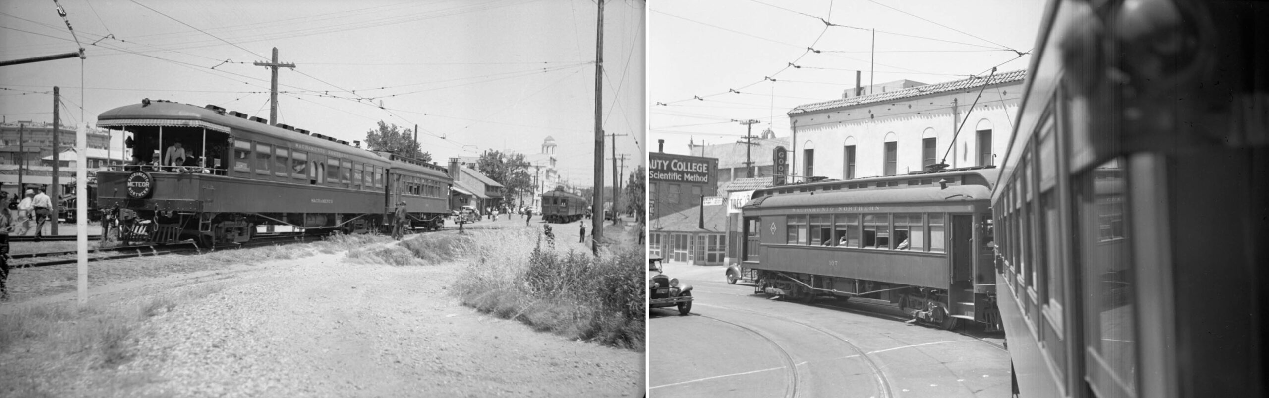 Time to get ready for the ride. Luckily, Howard Wolfe was on that June 16, 1940 excursion, seen in a northeast view setting up SN 107 and parlor car Sacramento at Maryville just west of the freight depot, left, and later turning from D. St. onto 5th St., right, northwest view. He took most of the images to be shown next. Although passengers Dudley Thickens and Paul Smith did take one image a piece, Wolfe took overlapping views from Tarke to Meridian.