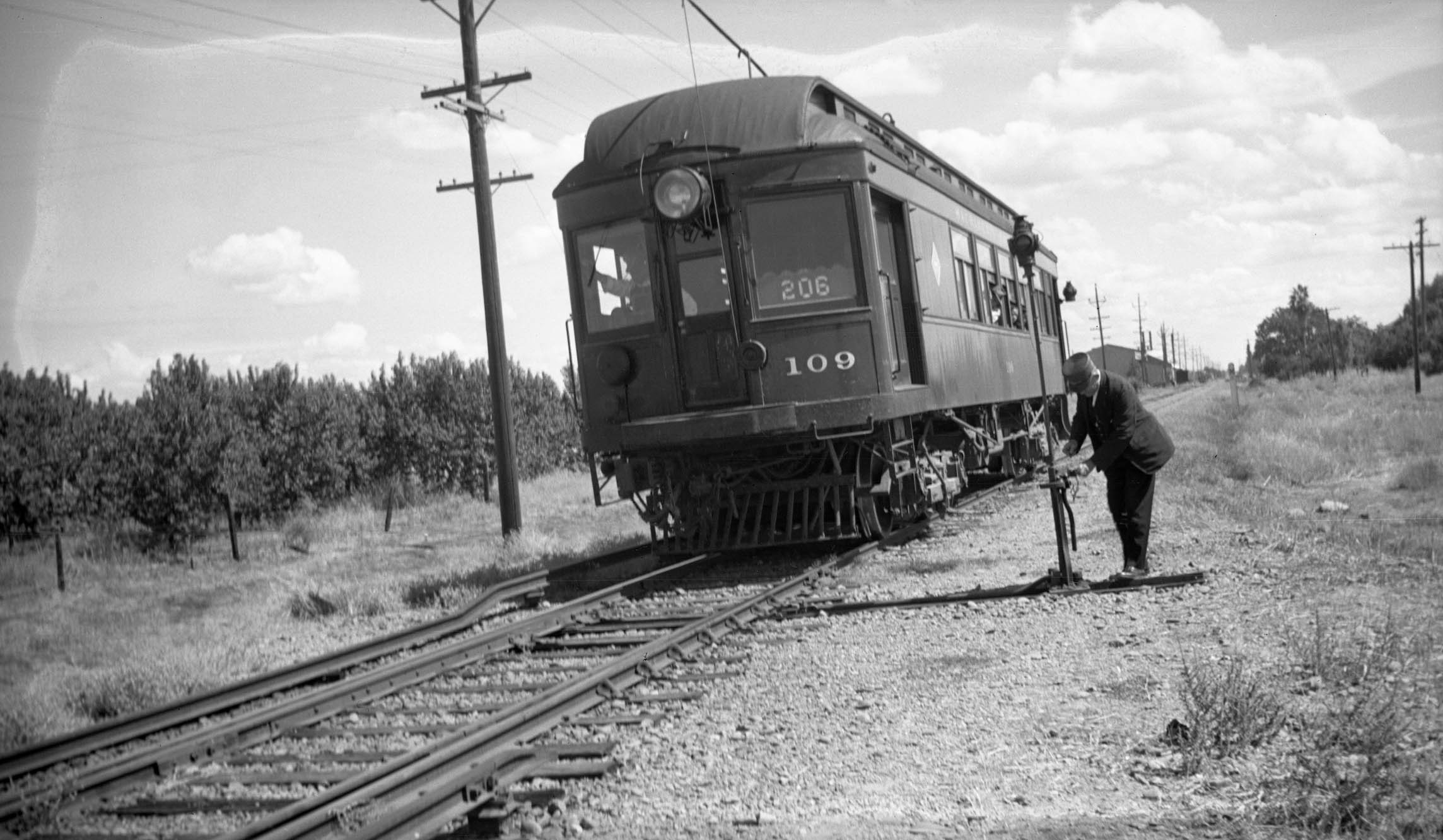 Although Colusa Local SN 109 as Train 206 may not have been the place pictures of the branch line were taken from, it did show up in several images and did transport photographers to get those images. Here the conductor sets the switch east of Colusa Jct. to access the branch line in 1940, east view.