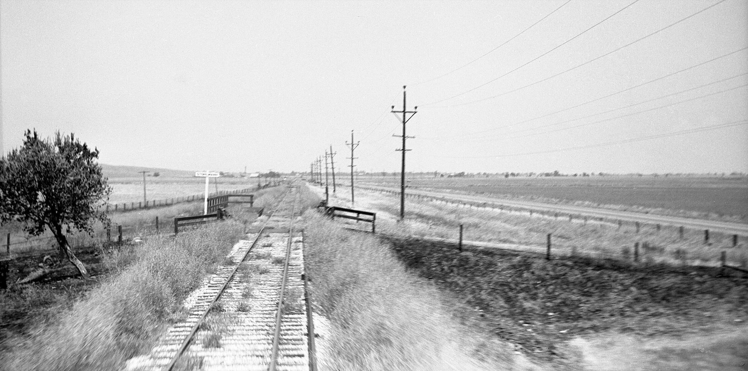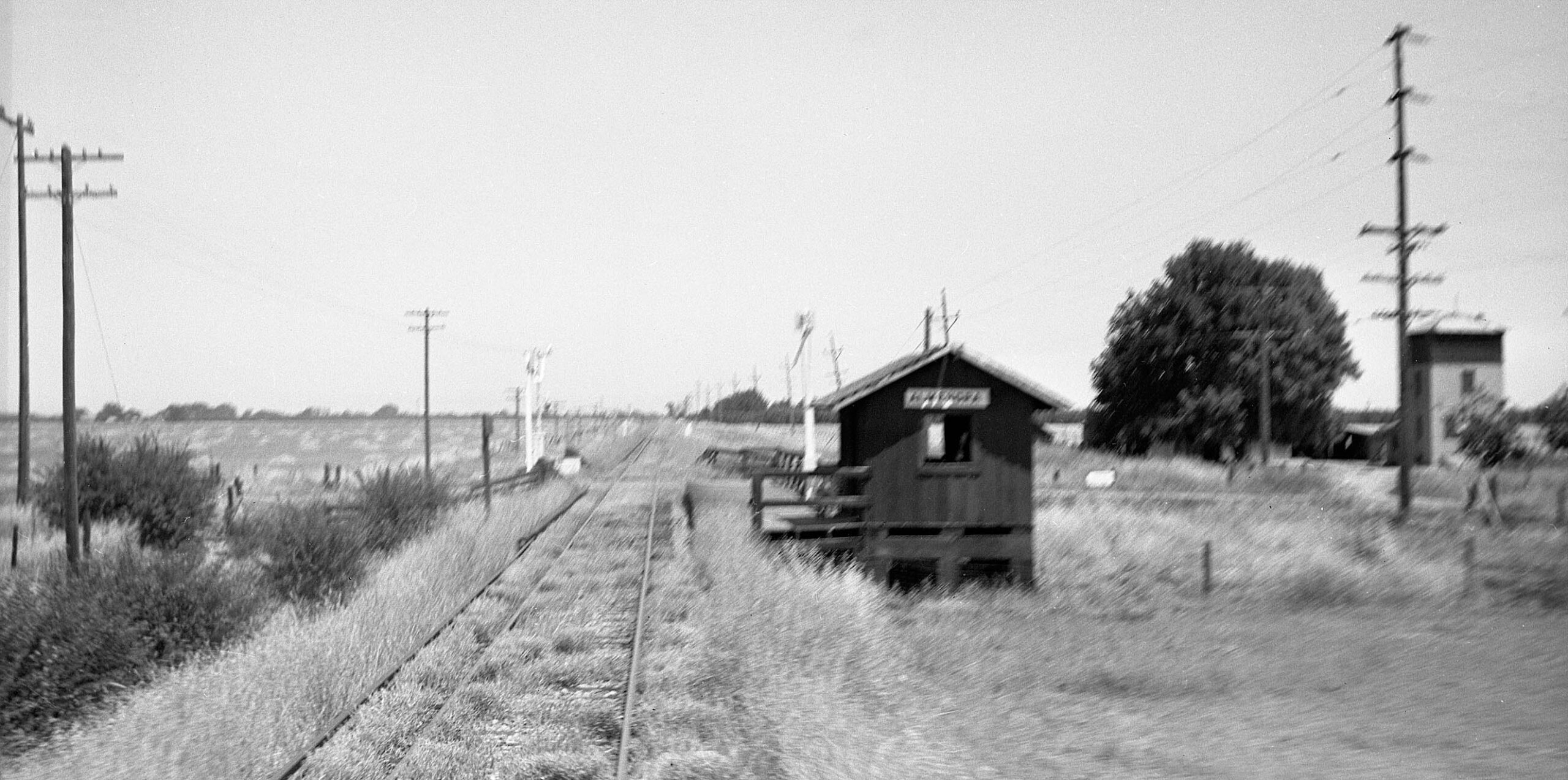 This was the only image found between Sutter and the Butte Slough-Sutter Bypass Overpass. The position of Highway 20 hugging the south border of the track, the curve of the right-of-way indicated by the poles in the distance, and the apparent presence of a small trestle seen as an dark irregularity in the right-of-way in the distance are consistent with an east view by the Stohlman sign. Trying to decipher these blurred signs is nothing less than treacherous based on several examples. It is not clear why Wolfe did not wait to photograph the substation. See the next image.