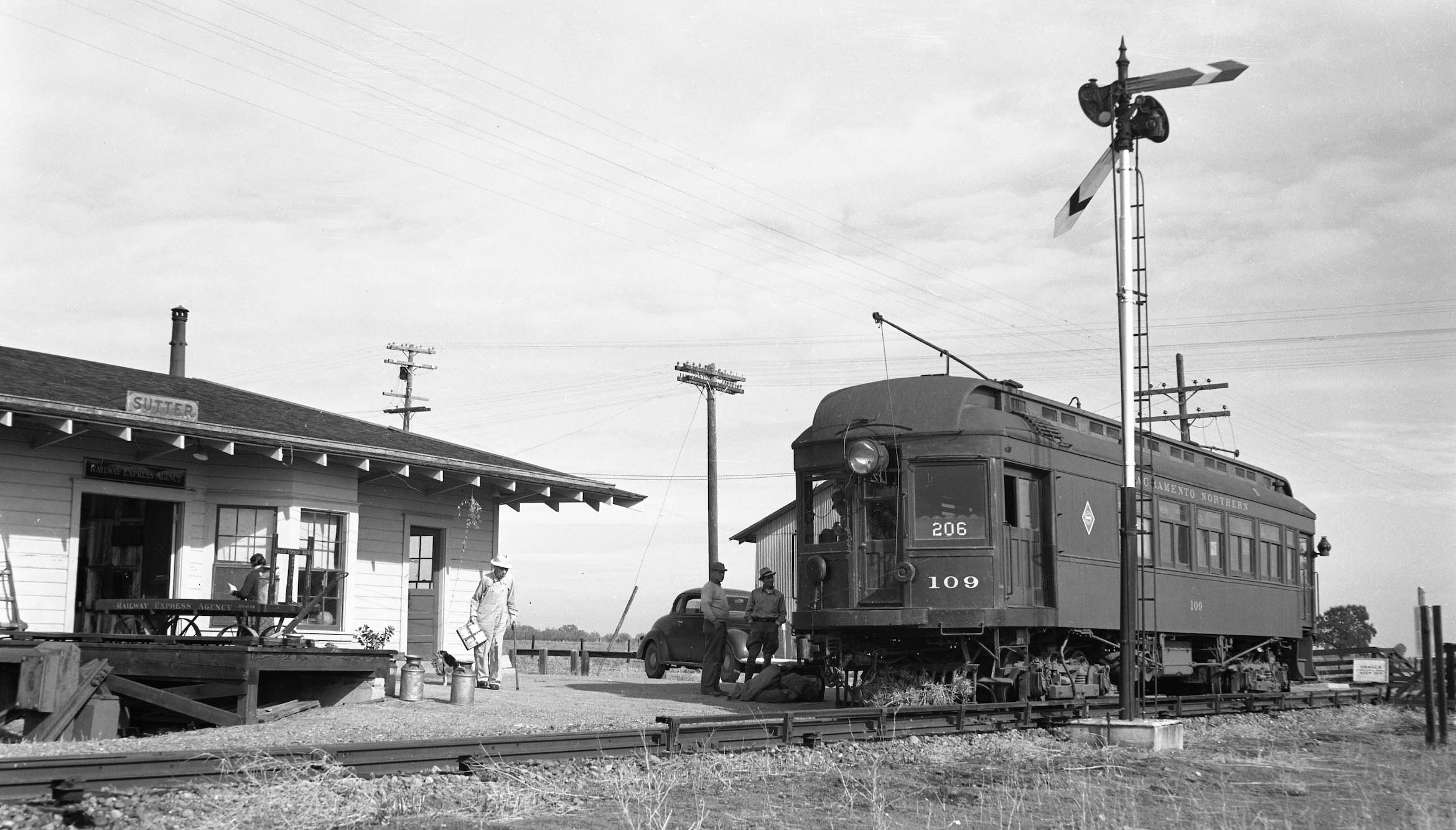 Nothing from the Humphrey flagstop in 1940, so on to Sutter, where Train 206 has arrived at the depot.