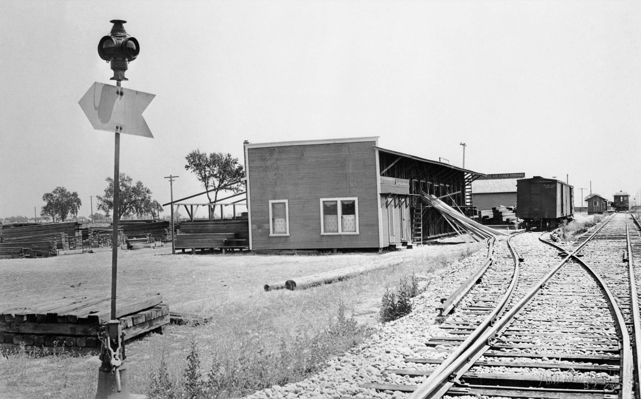Another ca. 1913 view, this time to the east, shows the lumber yard and Marysville Ice and Cold Storage. Note the smaller passenger shelter in the distance with a passenger train alongside it. The date it was replaced by the larger depot was not found.