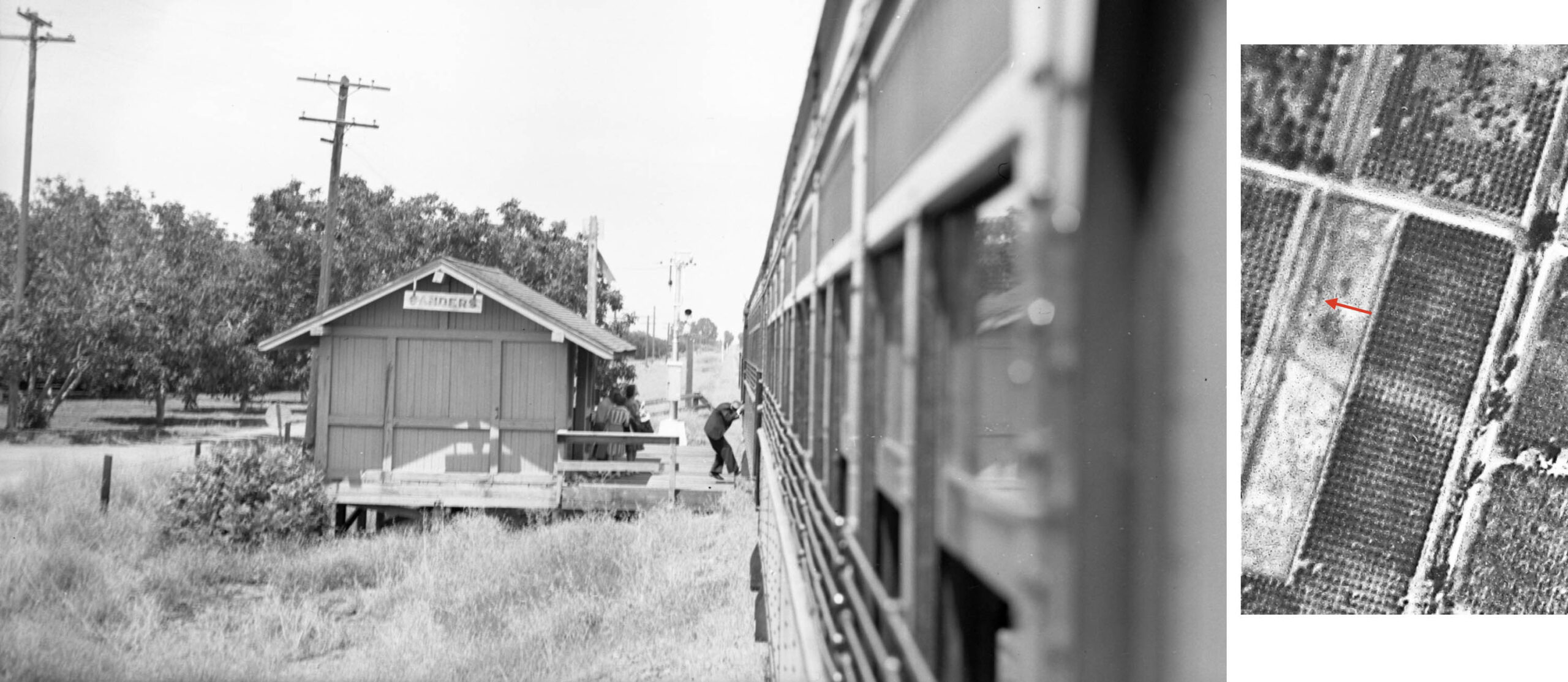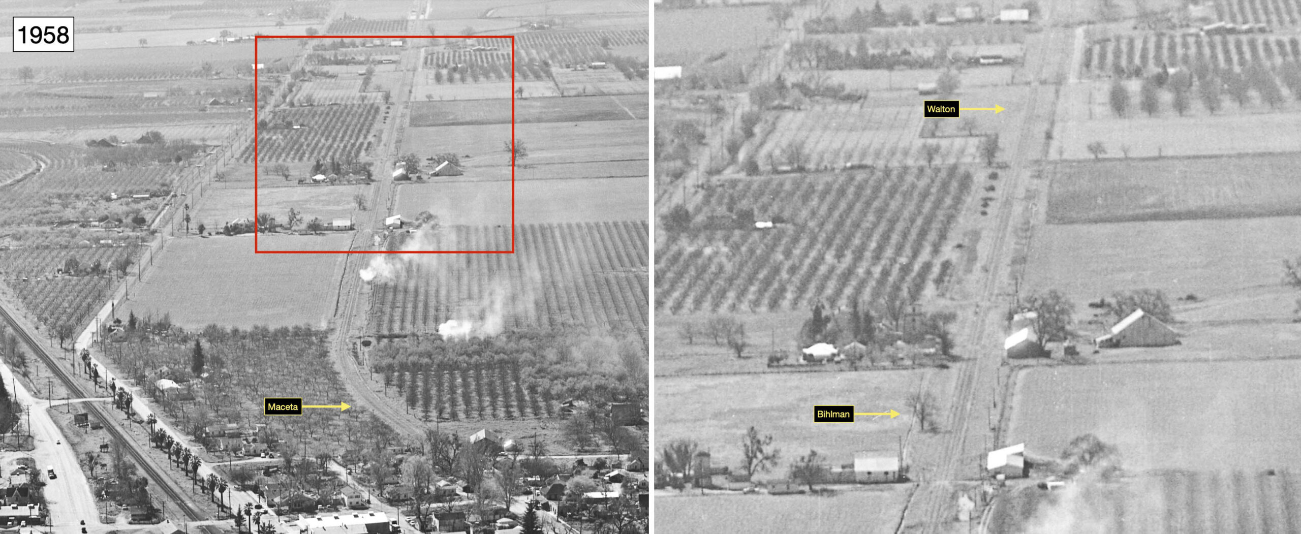 A south aerial view on the left from 1958, with the detail boxed in red on the right, shows the location of the three northern-most stops before Live Oak that have been summarized in this update. For more images in and about Maceta, click here.