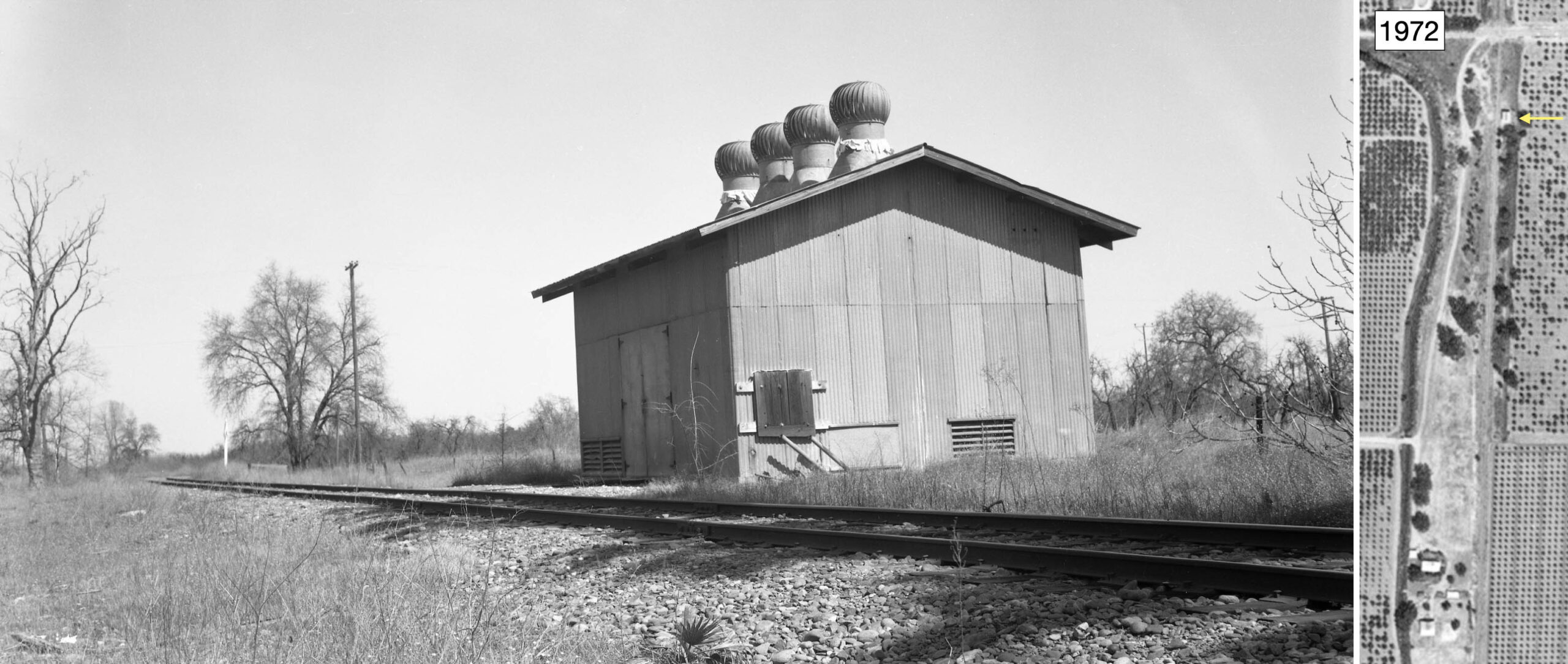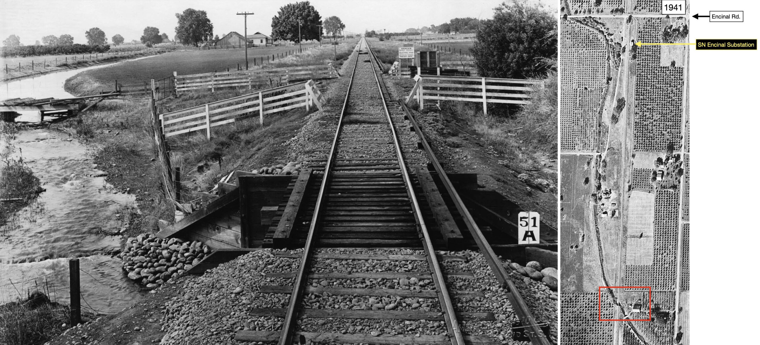 Before arriving at Encinal, our train crosses Live Oak Slough, the north view on the left from the American Photo Co. of San Francisco ca. 1910. They were unable to identify the location, but the “51” sign on the trestle should have alerted them that the scene was 51 miles from Sacramento, at that time downtown at 8th and J Sts., and not from Union Station that did not exist until 1925. This coincides with the slough crossing in question, shown on the aerial from 1941 on the right. The aerial also includes the next landmark, the Enicinal substation.