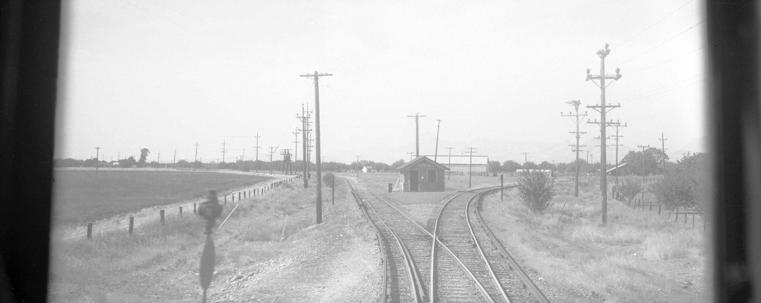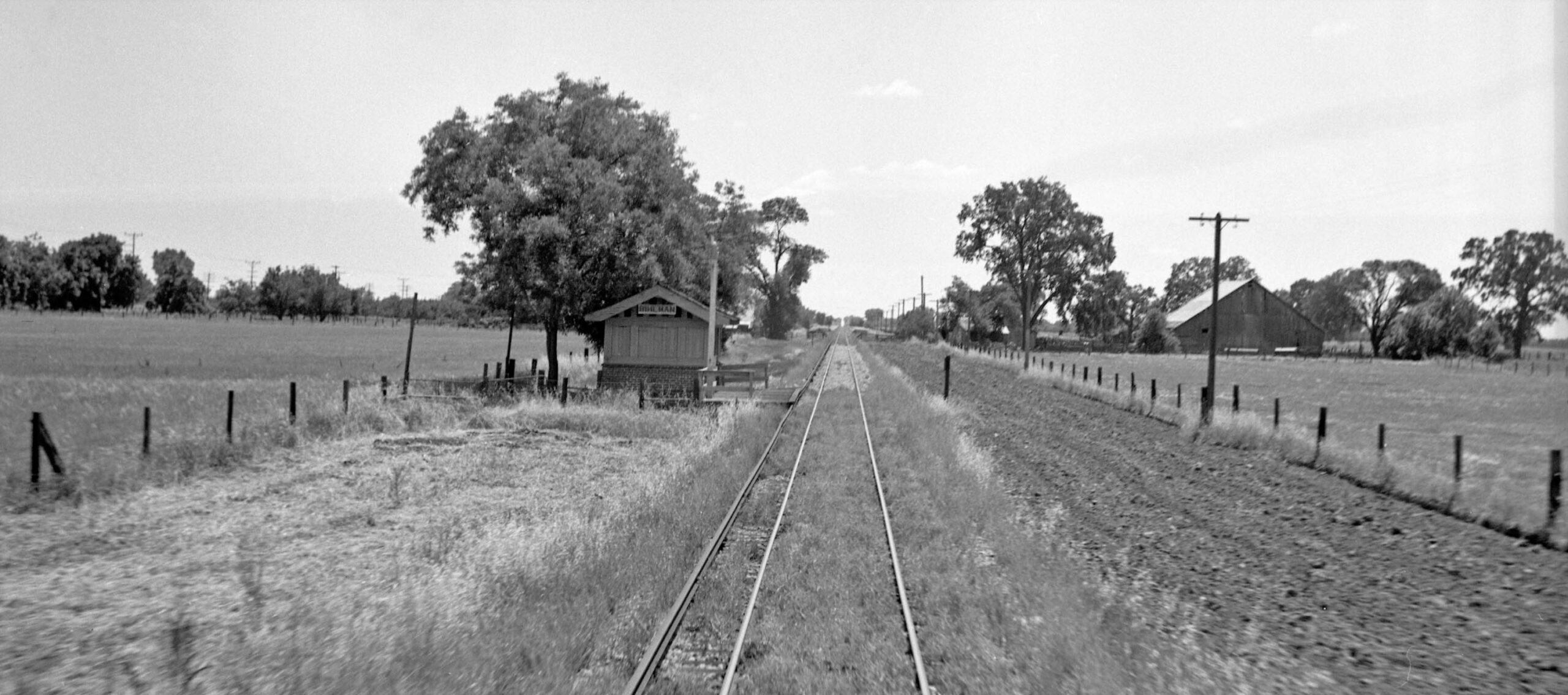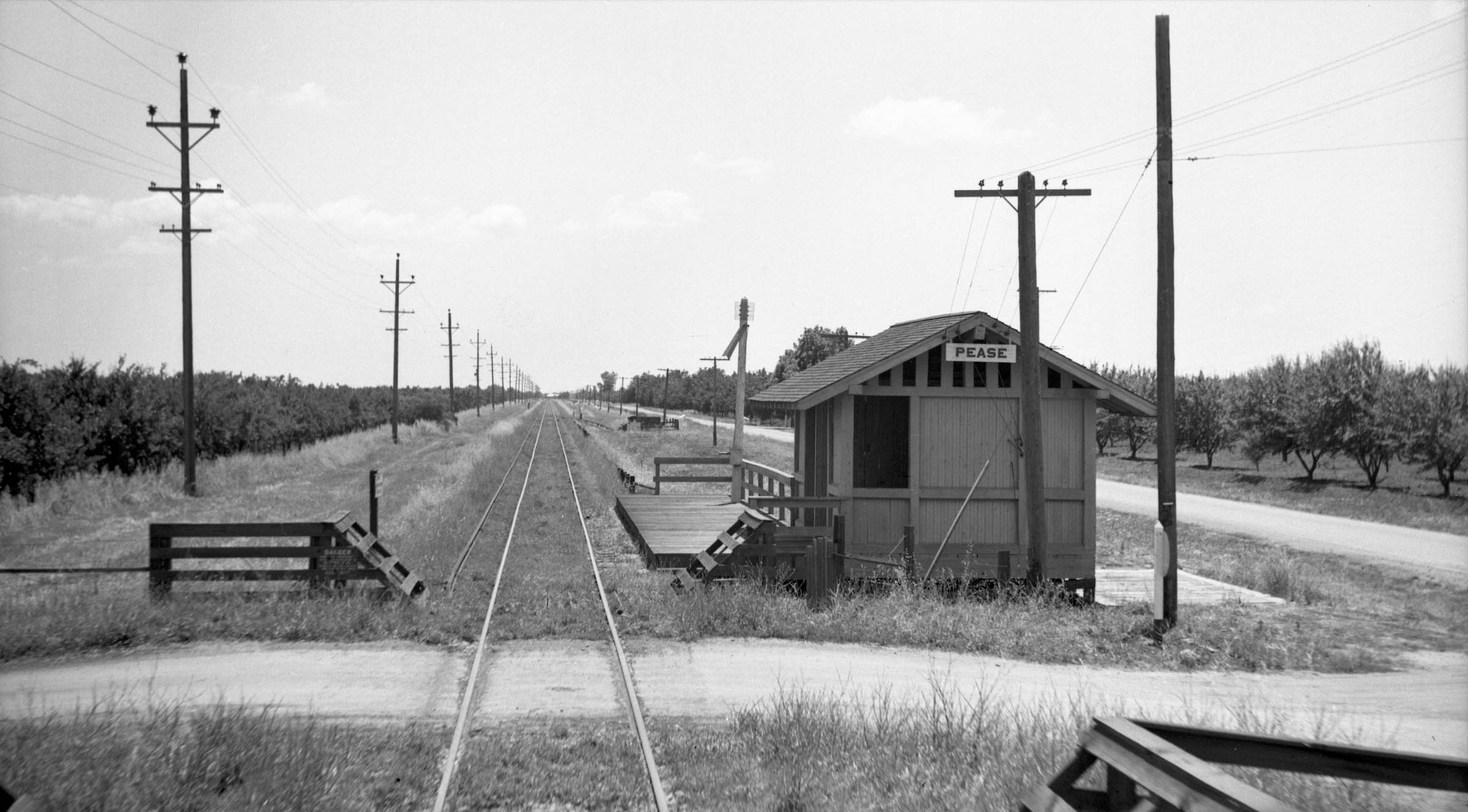 Our train does not stop at Pease, but a south view from the rear of SN 225 on June 2, 1940 shows starting left to right, the distinctive electric transmission poles used in much of Sutter County, the third rail along the east side of the rails, the spur in the distance said to have a capacity of ten freight cars, the wooden shelter typical for this section of SN track, the telephone poles to the west of the tracks, and Tierra Buena Rd. Note the small fence by the spur. The only element that cannot be verified is the siding with a capacity of 24 freight cars noted in the 1939 timetable.