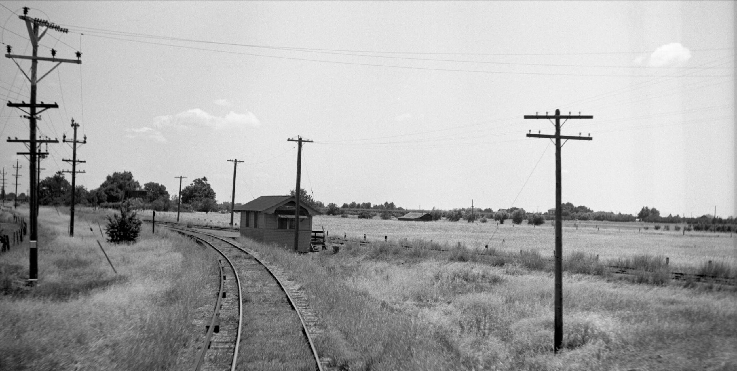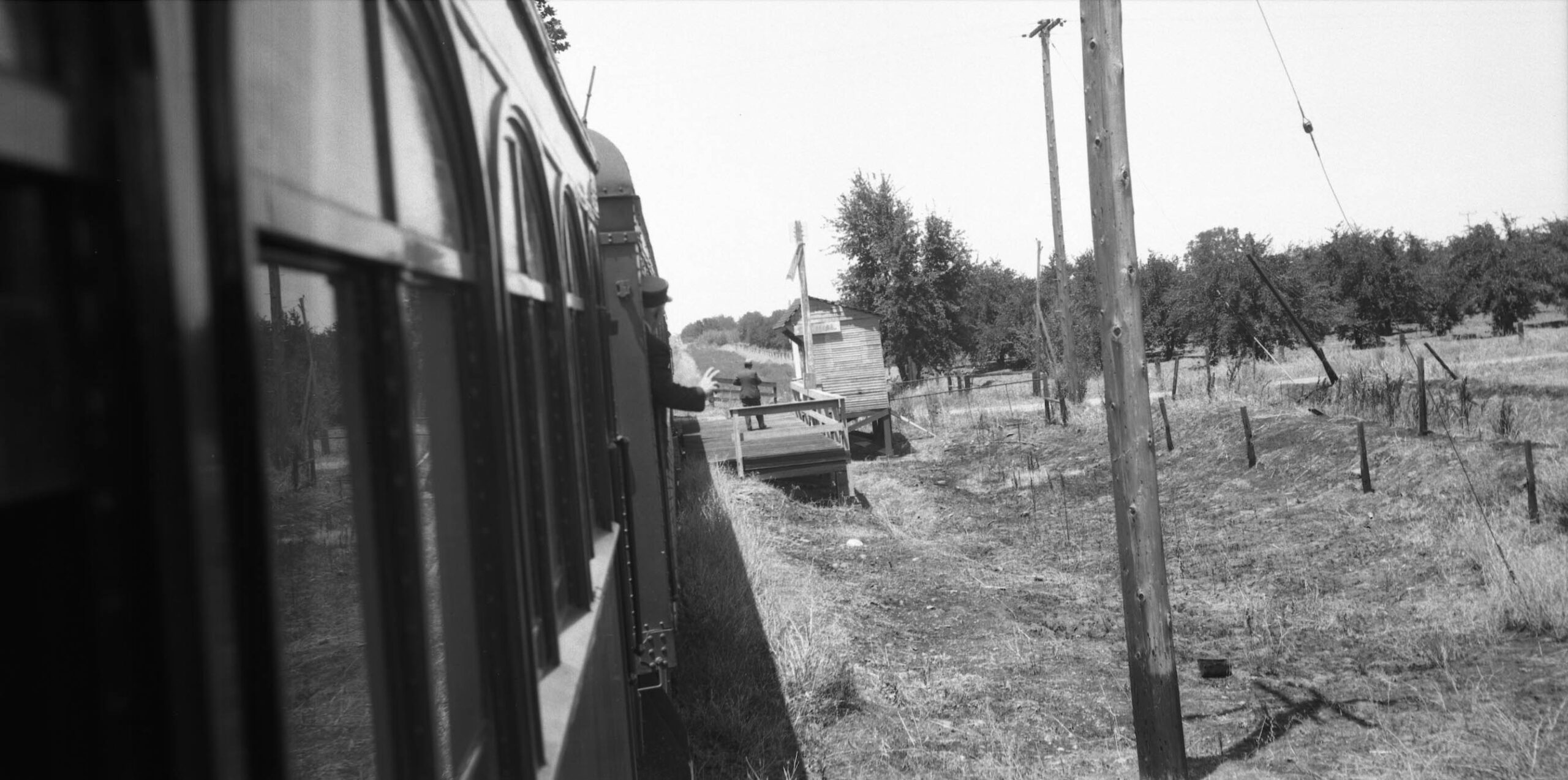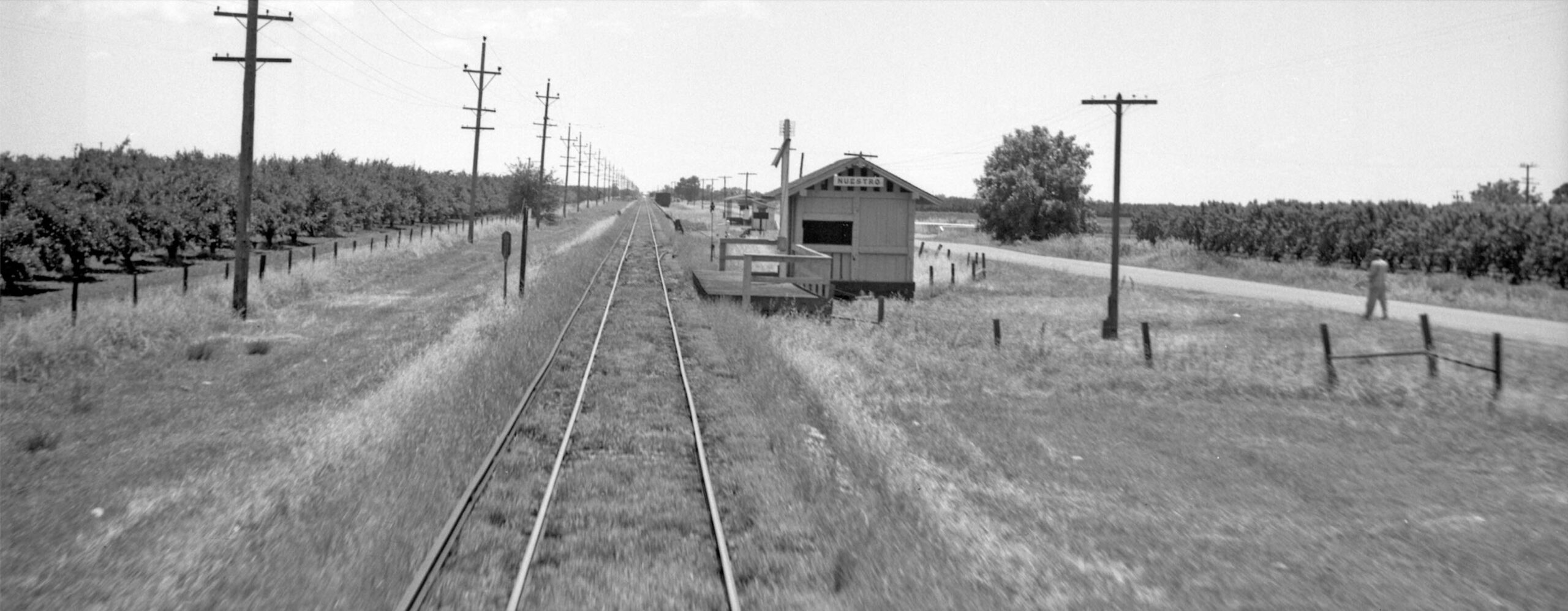 Our train does not stop at Pease, but a south view from the rear of SN 225 on June 2, 1940 shows starting left to right, the distinctive electric transmission poles used in much of Sutter County, the third rail along the east side of the rails, the spur in the distance said to have a capacity of ten freight cars, the wooden shelter typical for this section of SN track, the telephone poles to the west of the tracks, and Tierra Buena Rd. Note the small fence by the spur. The only element that cannot be verified is the siding with a capacity of 24 freight cars noted in the 1939 timetable.