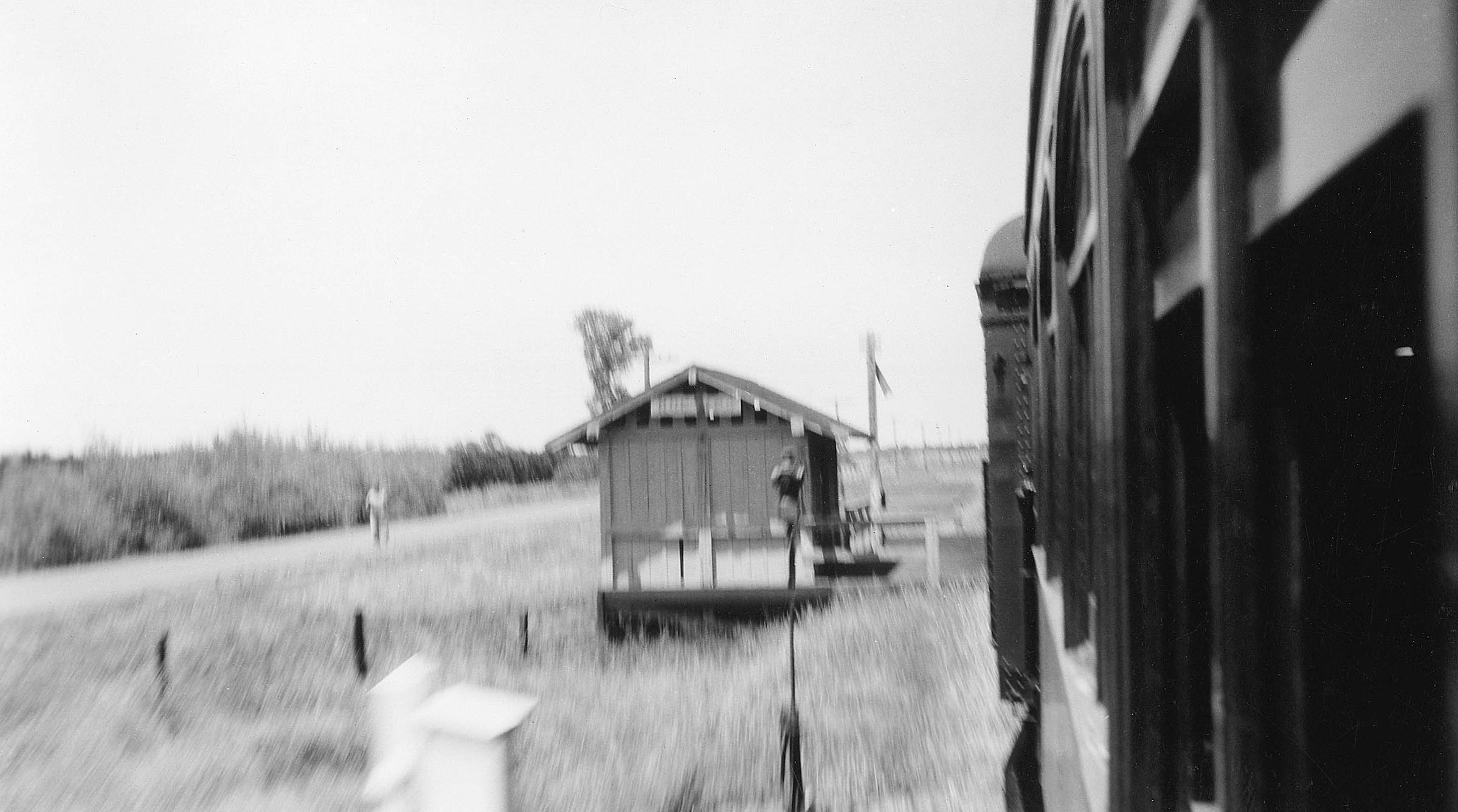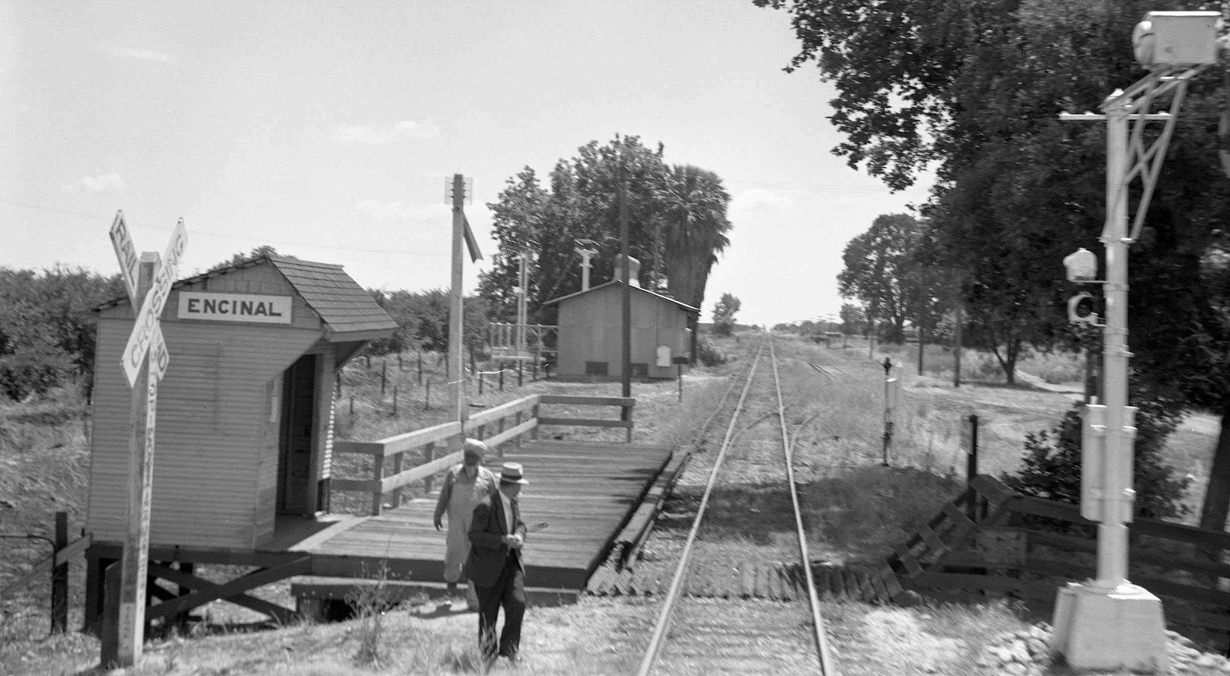 As our train stopped to let off passengers, Ted Wurm stuck his head out of the SN 225 on June 2, 1940 to capture this north view of the Encinal station shelter with the brakeman signaling the impending movement of the train after a single passenger departed. Notice that the electric transmission poles that had been last seen at Nuestro are not no longer present, probably gone when the road became Larkin Rd., but this has not been documented.