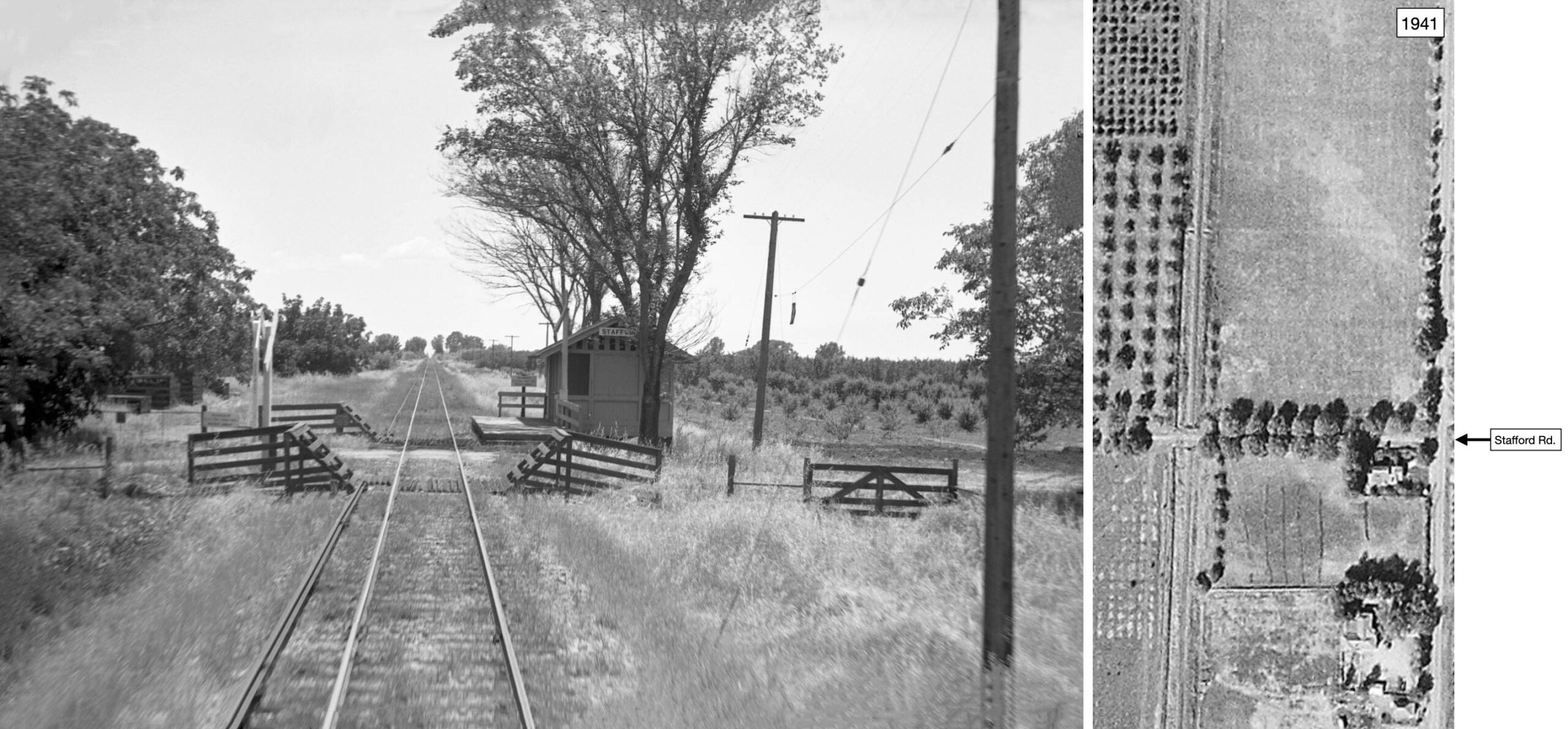 After leaving Stafford, the train crosses two more irrigation canals. No images were found from the next stop, Walton, but the aerials from 1937 and 1941 do show possible evidences for the eight-car spur indicated by the arrows north of Paseo Rd. the was listed in 1939 to be at this location.