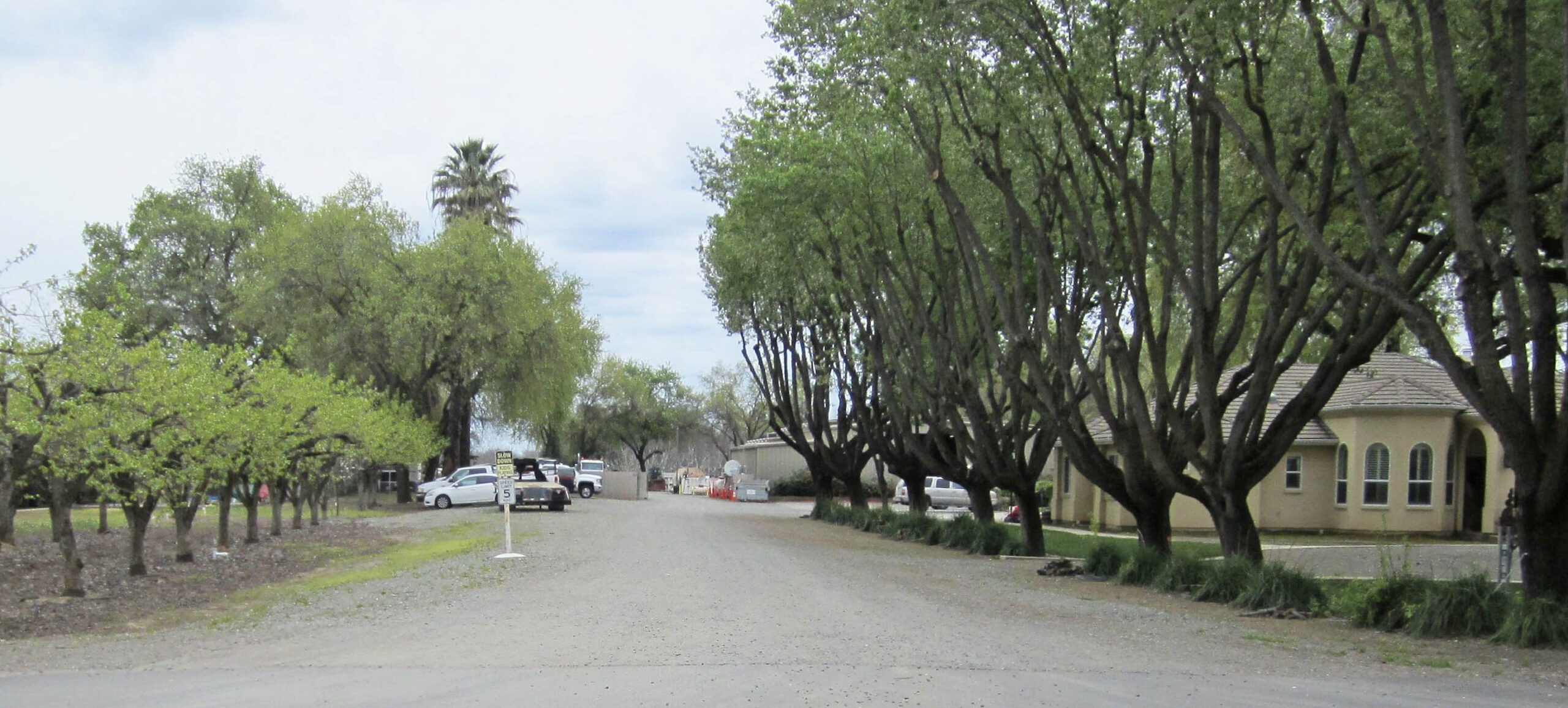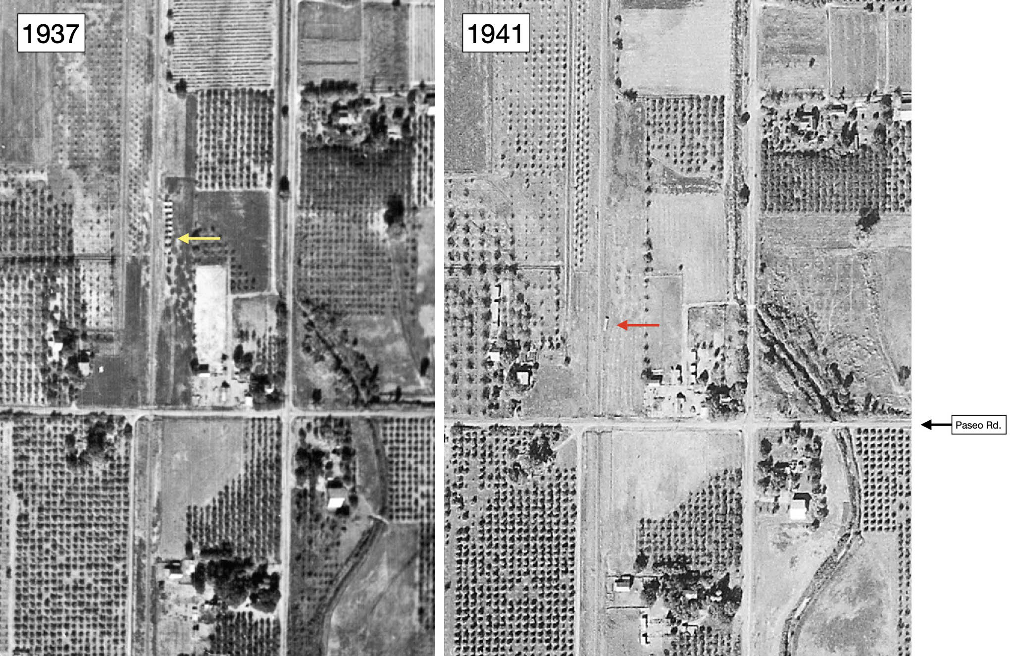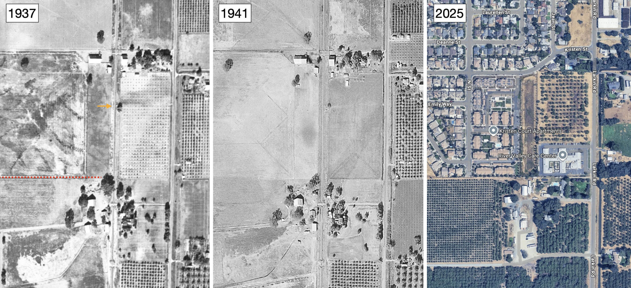 The orange arrow marks the position of the Bihlman shelter in 1937. The aerials suggest the shelter was removed by 1941, and the tree surrounding it was trimmed back. The dotted red line indicates the furthest south that new developments have been built in he southern portion of Live Oak. The spot here the shelter sat is still an orchard, but bordered on the south by River Valley Care Center as seen in the aerial from 2025.