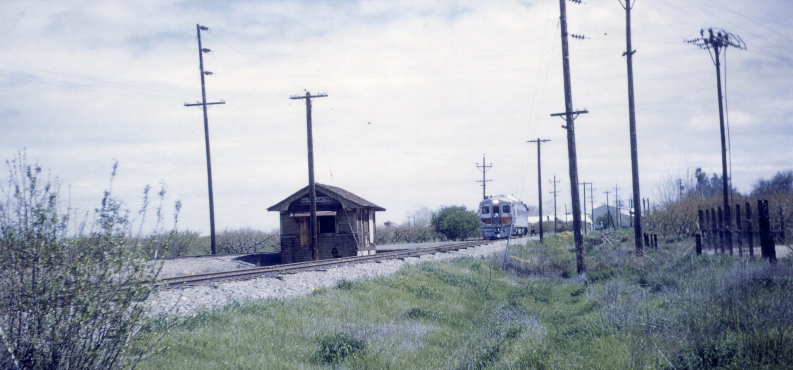 Next to start the journey on an electric passenger train ca. 1940 beginning with this panoramic west view of Colusa Jct. and its shelter taken from our approaching train. The trip will be addressed in the present tense as if the journey is occurring today.
