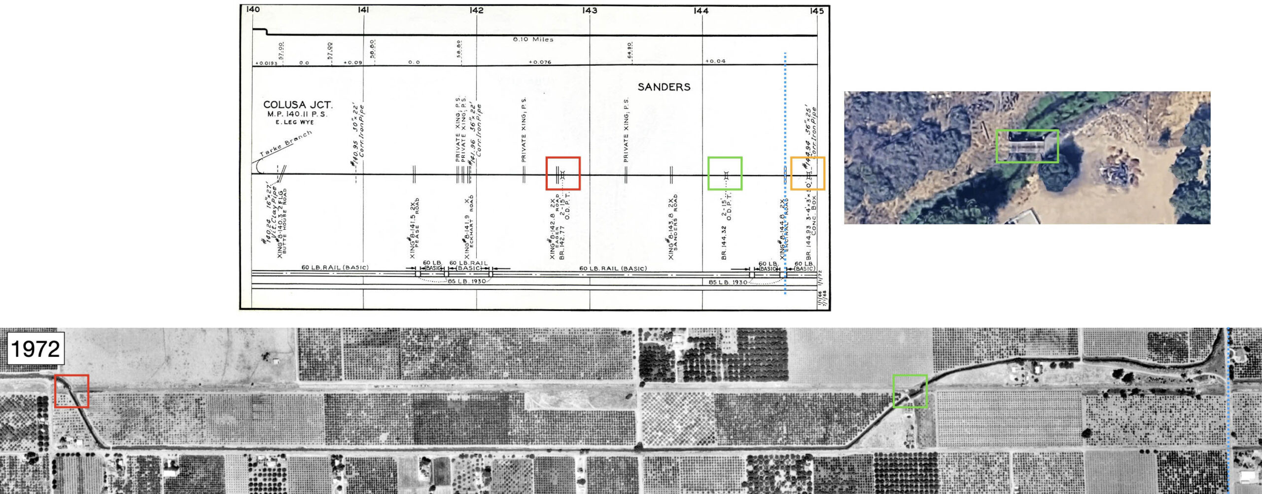The SN crossed sloughs or canals five times between Colusa Jct. and Live Oak, and all are intact in 2025. This diagram of the first part of the route between Colusa Jct. and just beyond Encinal Rd., broken blue line, shows three of them, color coded for identification versus the 1972 map presented south to north, left to right. A ground based image of the crossing of Live Oak Slough, green box, seen in L337-105 just south of Encinal station, was not taken, but the upper left image from Google Maps provides for its presence. Next for the crossing marked by the red box.