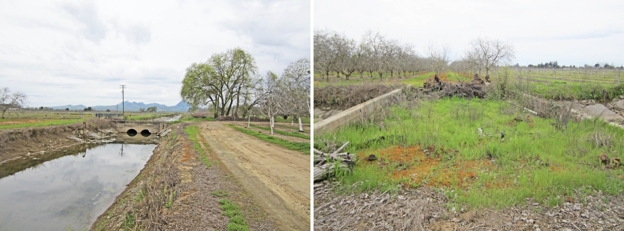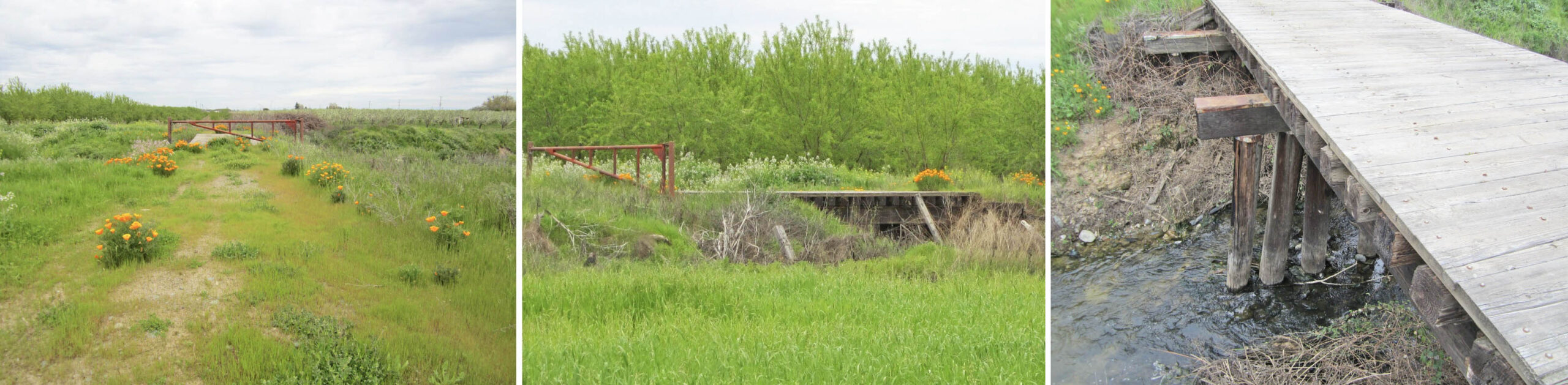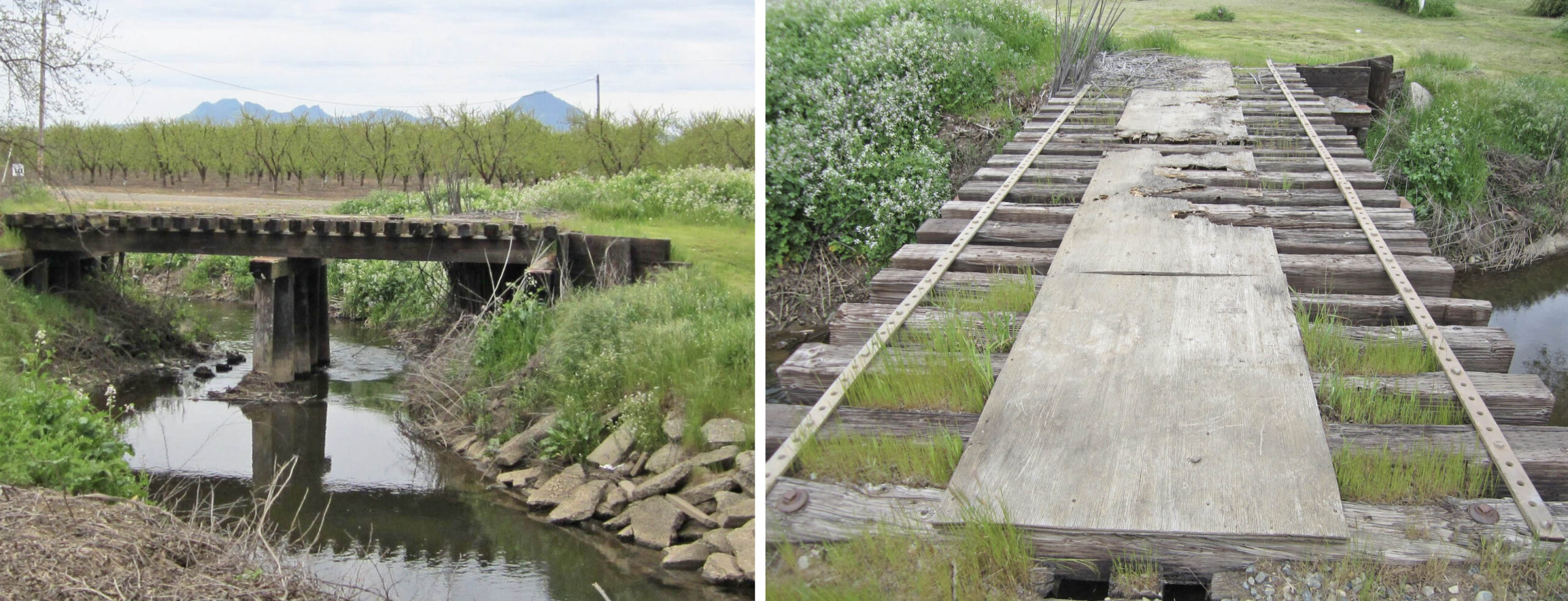 The southernmost crossing was just north of the grade crossing at Eager Rd. where Tierra Buena Rd. transitions to Larkin Rd. A north view from the Live Oak Canal crossing is shown in the left image from Apr. 1, 2018, with two details to the center and right.
