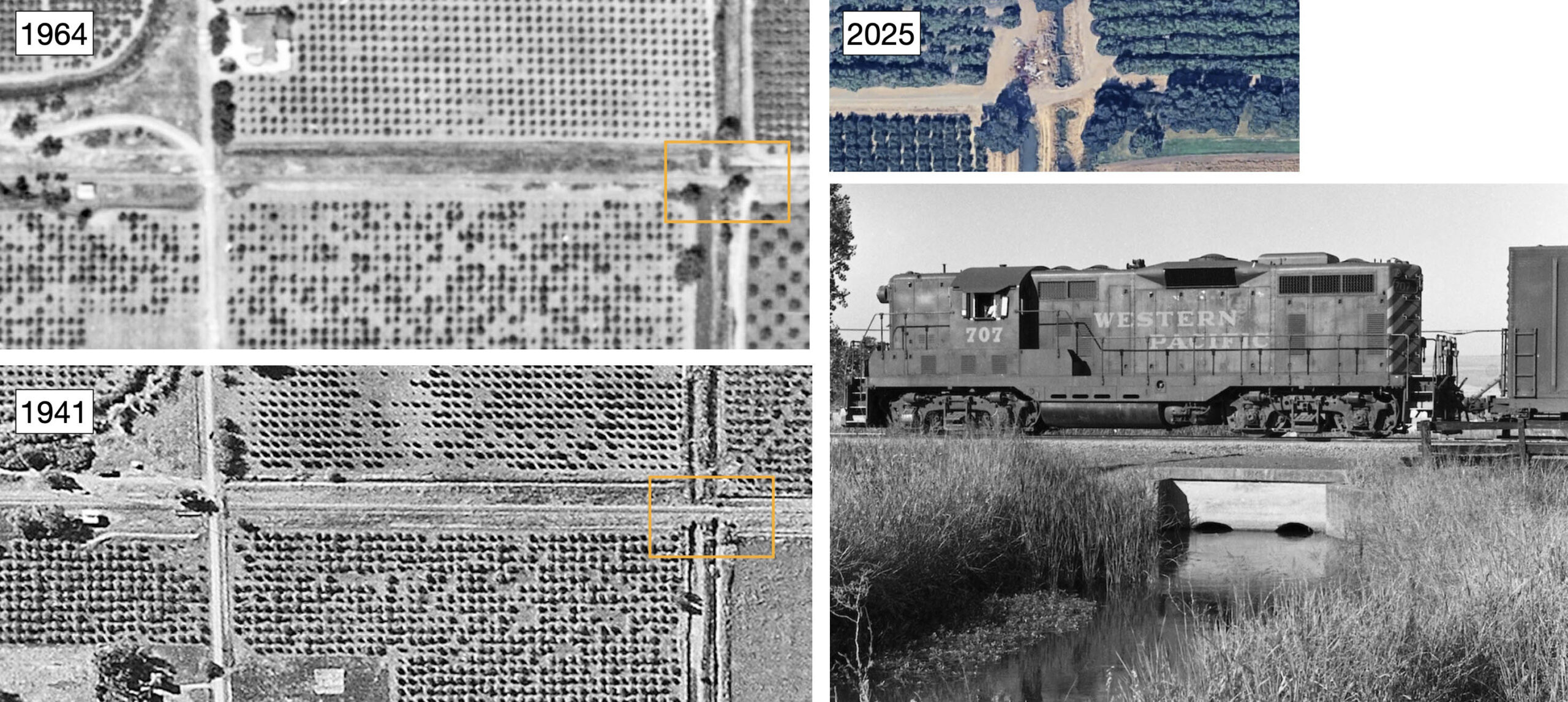 The canal crossing marked by the brown box in L337-162 just to the north of Encinal Rd. is shown how it appeared in 1964, 1941 and 2025. It almost appears as if the canal was modified to be offset between 1941 and 1964, and in 2025 there is no evidence of a trestle. The image taken by Wayne Monger ca. 1980 with WP 707 in the lower right might show part of a concrete base that made up part of it. There will be an additional crossing where the structure is also made of concrete, but it looks somewhat different and will be shown soon.