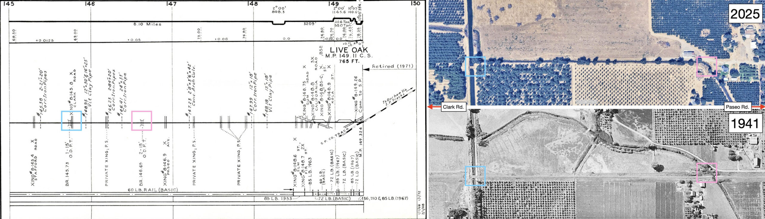 Continuing to the next SN right-of-way diagram, two more crossings are marked by blue and pink boxes were present between Clark and Paseo Rds. That existed in 1941 and are present in 2025. The one marked in blue will be discussed first.