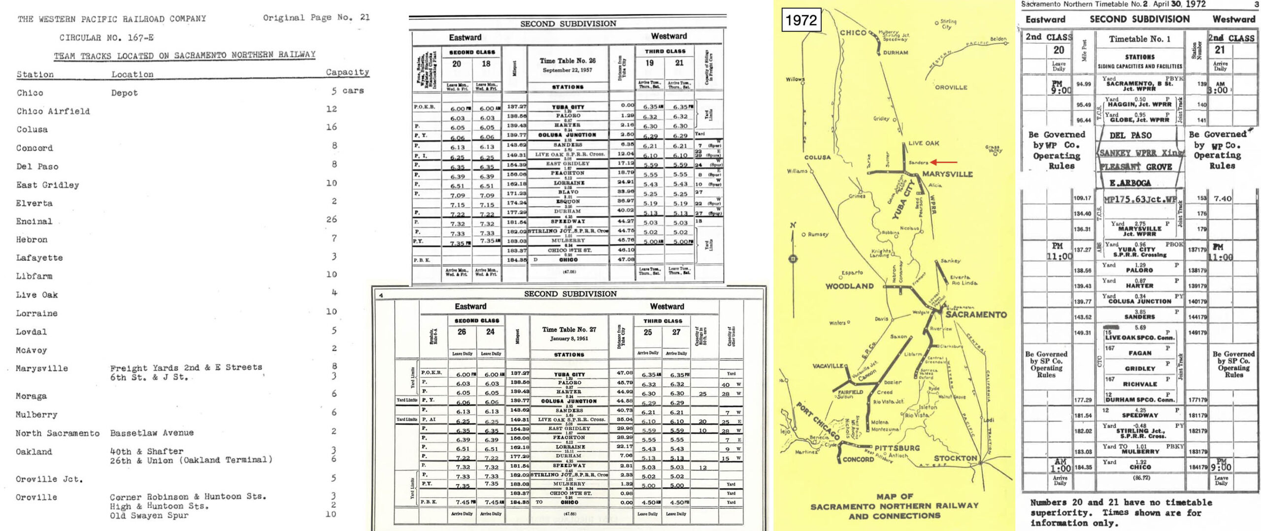Demoro notes in his chapter “A Ride on the Sacramento Northern” that the area between Colusa Jct. and Live Oak was a prosperous agricultural country, the Thompson seedless grape and Philip cling peach originating there. The WP Circular No. 167-E ca. 1957, left, only lists the Encinal team track as a SN customer between and excluding Colusa Jct. and Live Oak, yet the 1957 employee timetable, top center, indicates only Sanders seven-car spur as a stop. The map and 1972 employee timetable also only list Sanders.