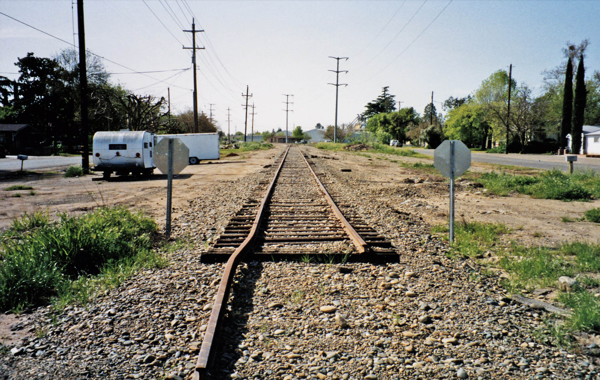 • The southernmost crossing was just north of the grade crossing at Eager Rd. where Tierra Buena Rd. transitions to Larkin Rd. A north view from the Live Oak Canal crossing is shown in the left image from Apr. 1, 2018, with two details to the center and right.