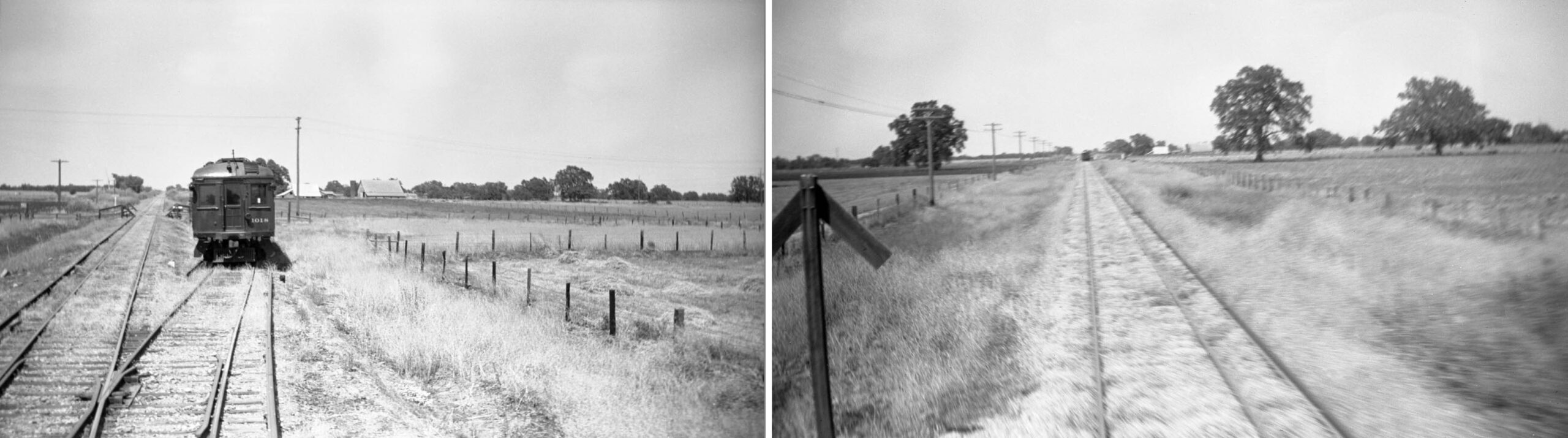 The north view on the left of Sacramento Northern, SN 1018 “in the hole” in 1940 shows more adjacent farm structures added relative to the ca. 1910 image. The view on the right appears to have been taken further south as the train traveled toward Sacramento. Gathering enough of these images, combining them with aerial views available between 1937-1941, and using a computer to align them would represent one way to possibly identify and string together the SN route. A more iterative approach prior to that exercise is explained next.
