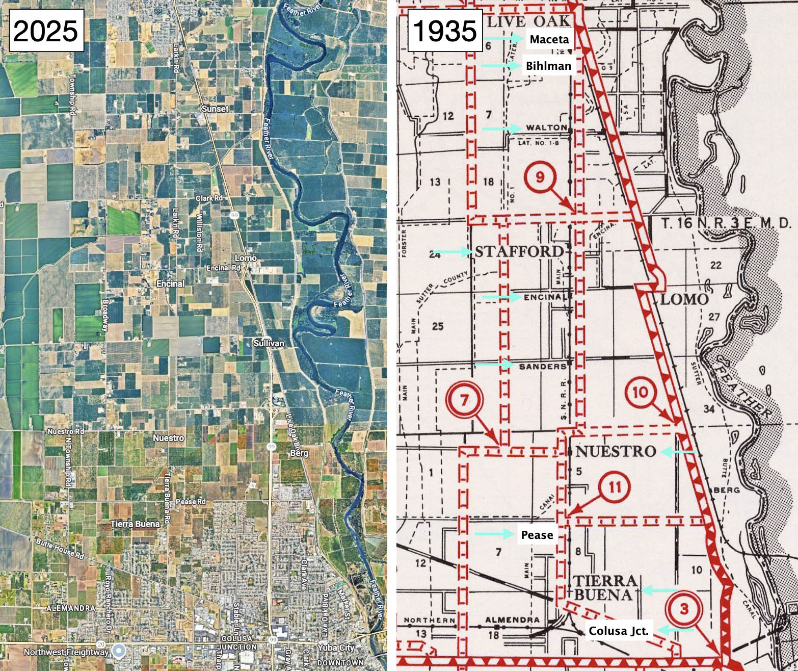 As a reminder of the area of interest, this Sutter aerial from 2025 and 1935 map have been lined up. Note that additional station stops have been added to the 1935 map of Sutter County, with each stop marked by a turquoise arrow. Ref, right, California Division of Highways 1935 Sutter County, from the Institute of Transportation Studies Library, Harmer E. Davis Transportation Library, at the University of California, Berkeley