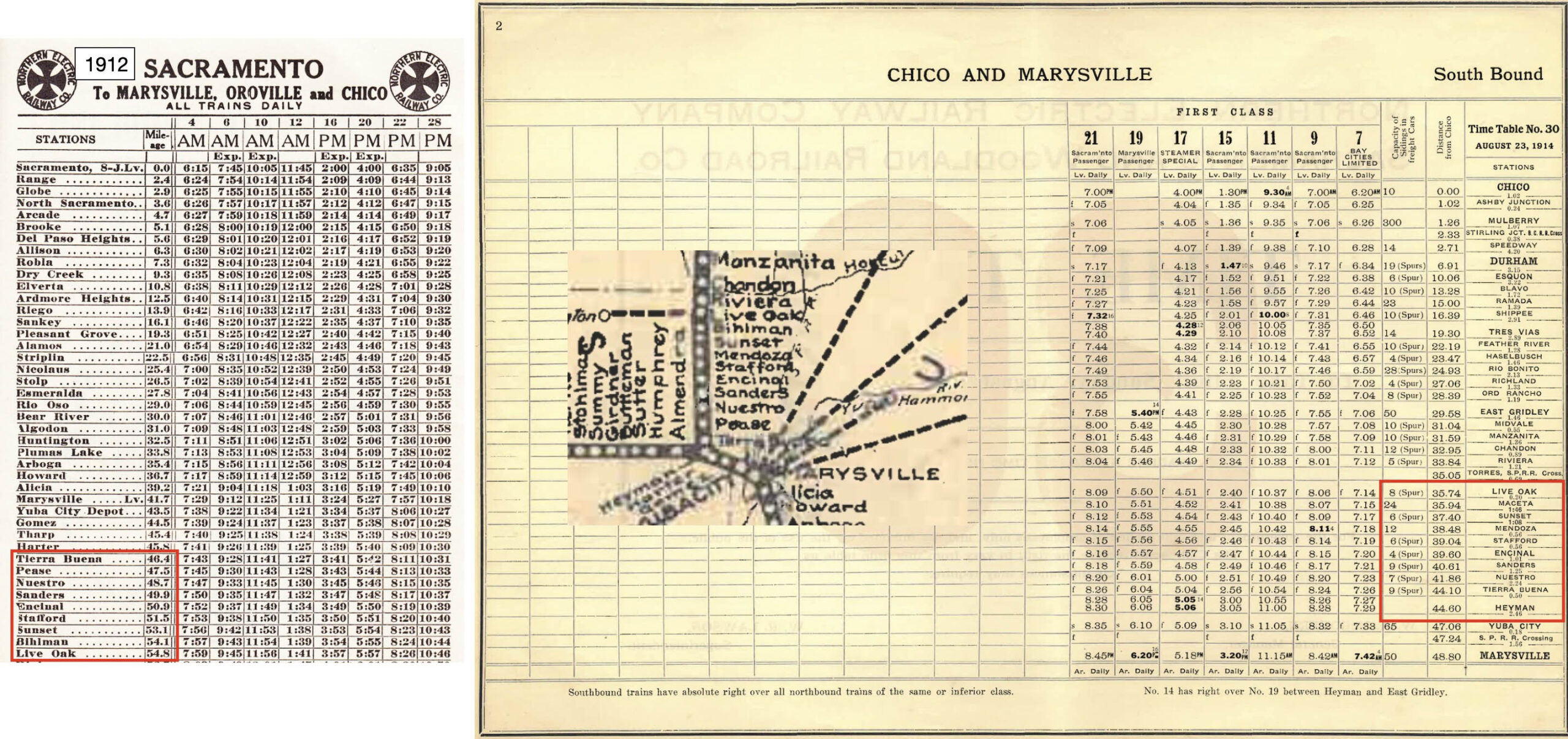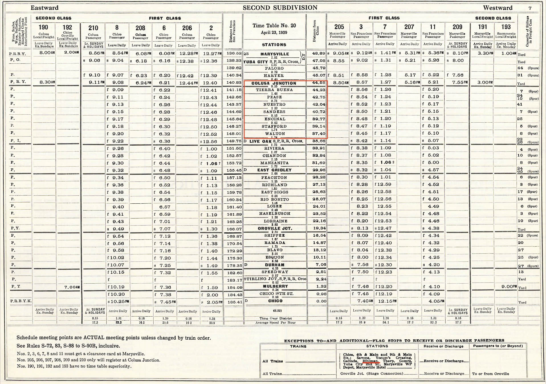 Looking ahead to the last issued employee timetable before the cessation of passenger service on the North End, no. 20 from Apr. 23, 2025, Maceta is no longer listed, and Bihlman is listed as a flag stop.Before going on to the next panel, appreciate that the section covering Yuba City to Colusa Jct., click here, or within Live Oak, click here, are presented in “Central Valley Connections” section, and are not included in this presentation.