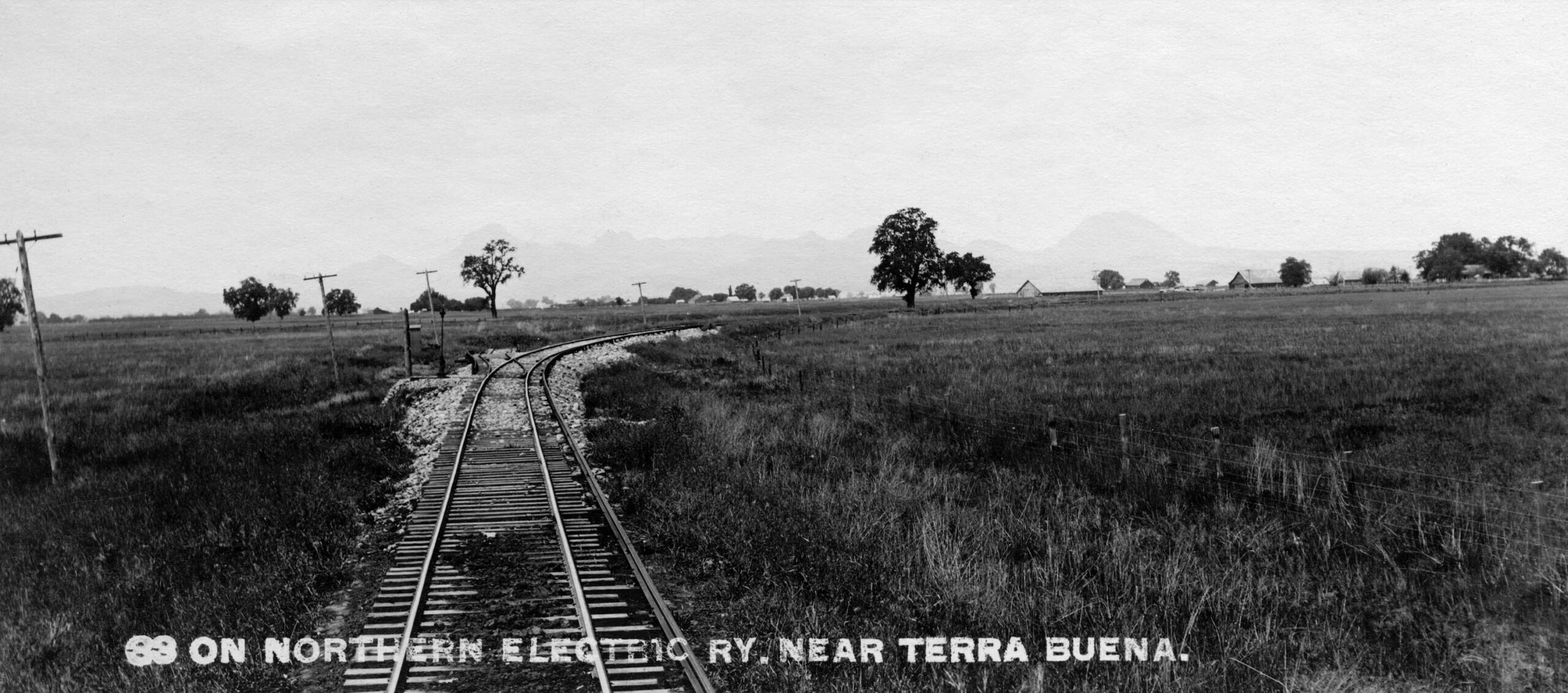 Now to images of the route itself. This west view with the Sutter Buttes was taken at the future site of Colusa Jct. At this point, there was no Colusa Branch, as the Marysville and Colusa Branch did not open until June 13, 1913 according to Demoro’s “Sacramento Northern.” This ca. 1910 view does, however, show a small spur heading toward Colusa. Note as well that the NE used the Latin or Italian spelling of land, “Terra”, rather than the intended Spanish name of this place, “Tierra.”