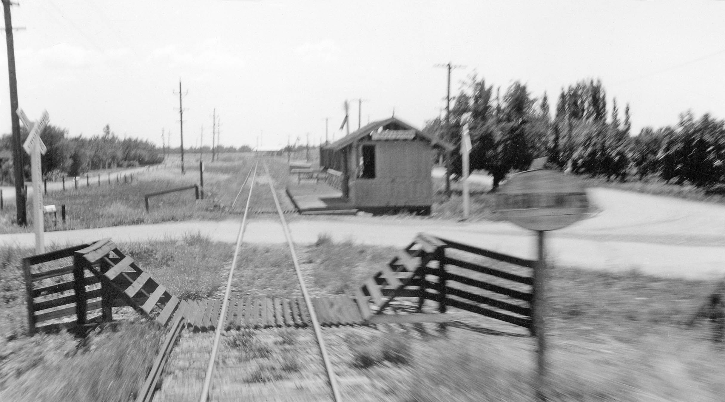 • Thanks to Howard Wolfe staying near the open rear door of SN 225, our south view of the Nuestro station looks very similar to the one at Pease, except that there appears to be a smaller structure just to the south of the shelter. As noted in the 1939 timetable, the forty-one car siding can be appreciated by the distance of the boxcars seen in the background. After Nuestro, the train crosses a grade crossing and then Live Oak Canal as the parallel road swings to the east of the tracks and is now named Larkin Rd.