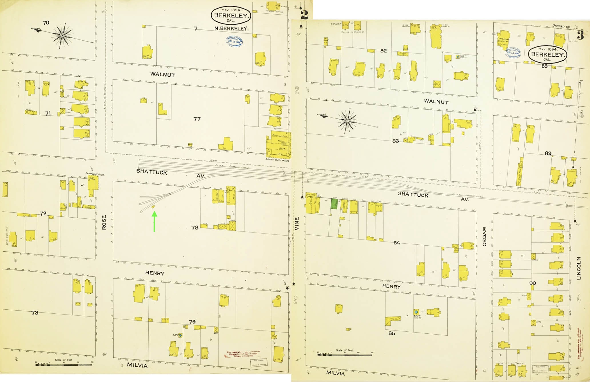 In the first update in this series, the SP was shown to have a mainline into Berkeley via Shattuck Ave. originating as The Berkeley Branch Railroad, a subsidiary of the Central Pacific Railroad, CP, that eventually terminated at Shattuck Ave and Vine St. in 1878. No image of the terminus was found, so this 1894 Sanborn map will serves as a surrogate to show the street and track layout during the railroad steam era. In addition to track veering off Shattuck Ave. toward Henry St., the green arrow points to a small structure that will become an important landmark shortly.
