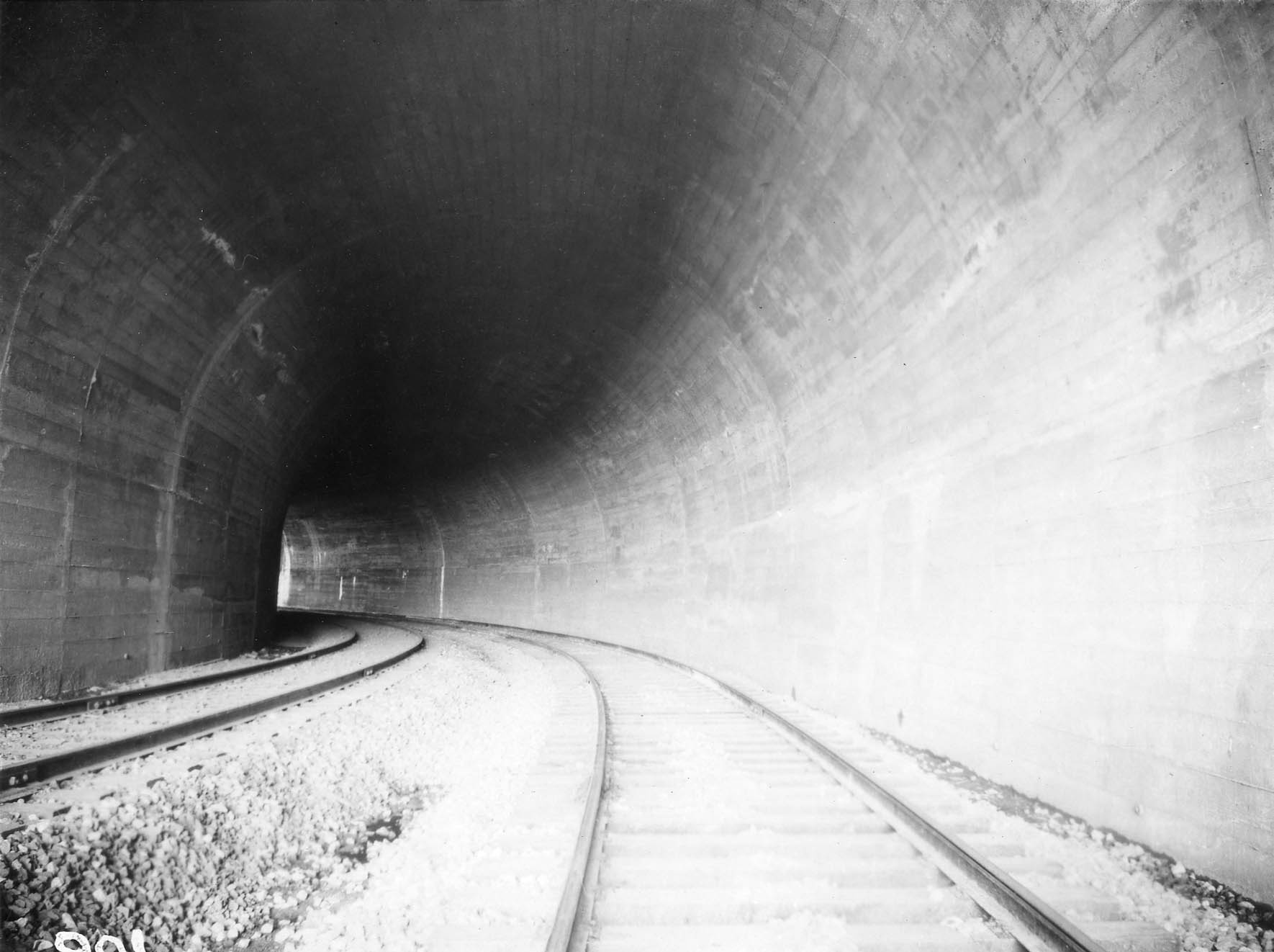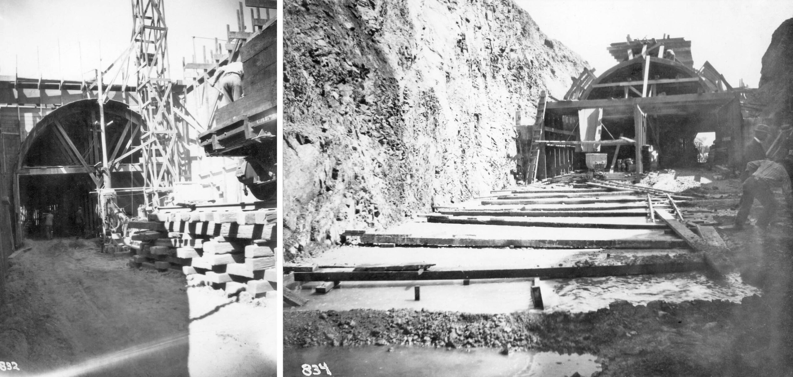 North, left, and south, right, views from Aug. 20, 1910 show concrete being mixed and applied to the tunnel frame.