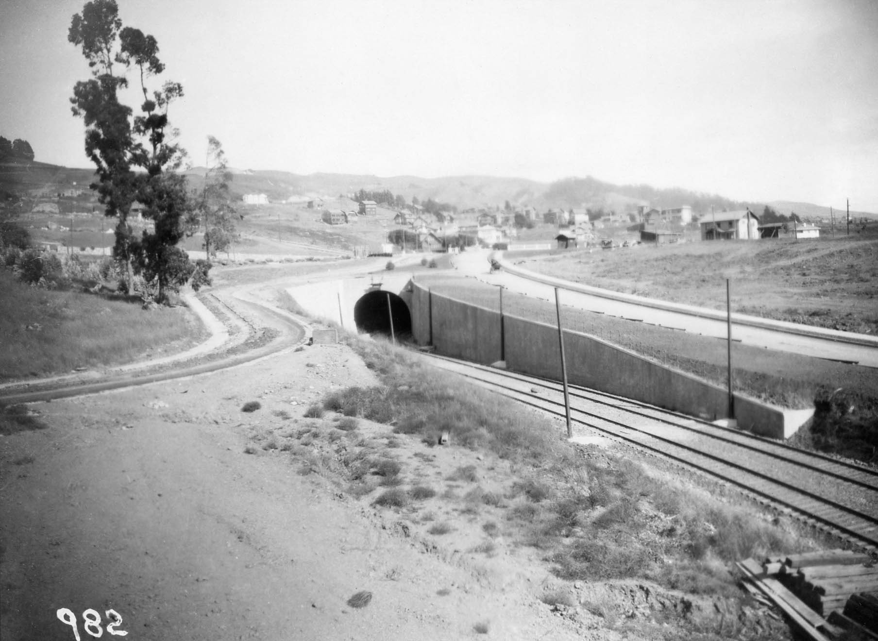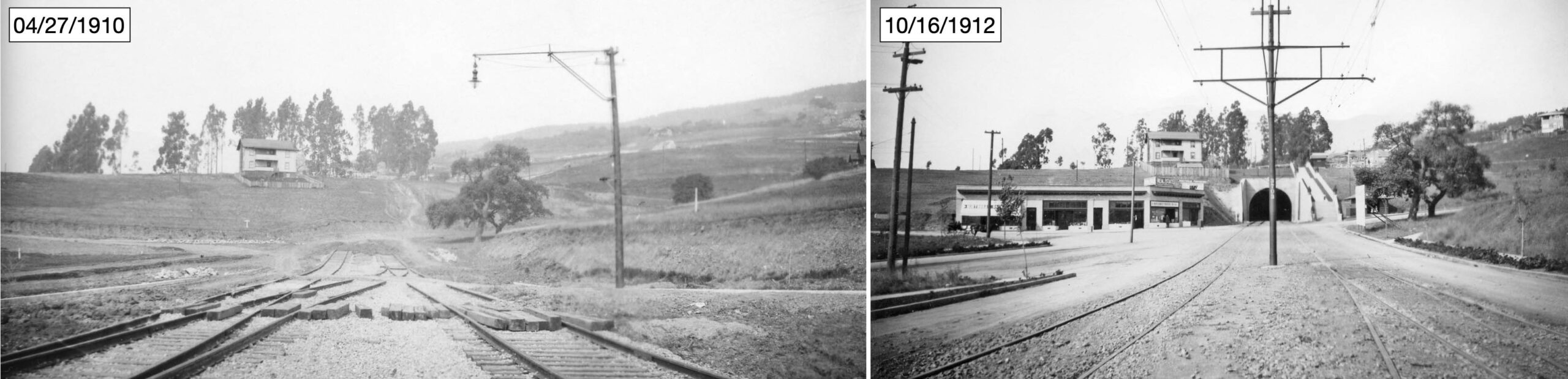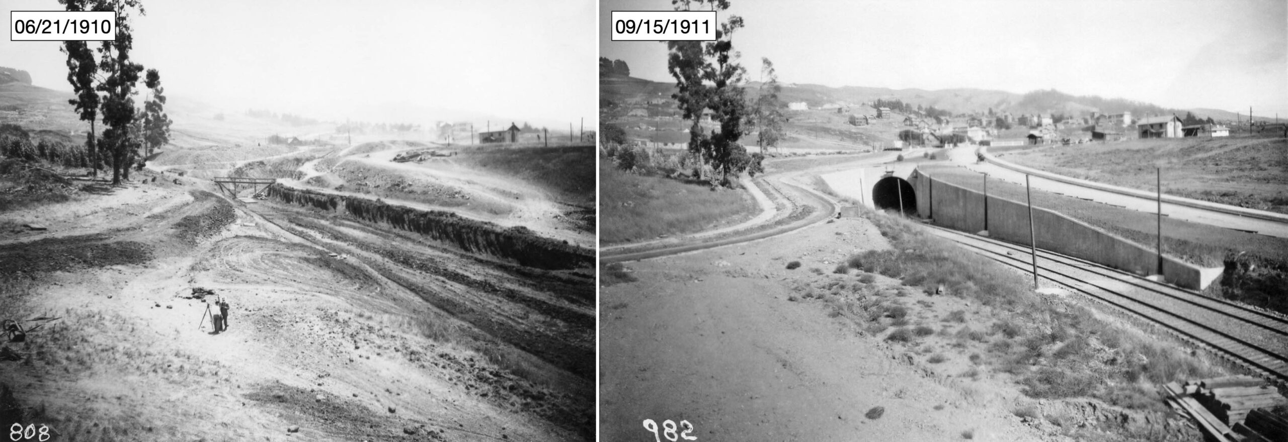 Once on Sutter St, the next and largest obstacle to the extension of the SP Shattuck line was the tunnel under the future Circle, shown before and after in these north views left and right, respectively. The house seen to the left or west of the tunnel is no. 1994 Marin Ave. as will be seen in the images that follow. This house miraculously survived the tunnel construction and is still present in 2026.
