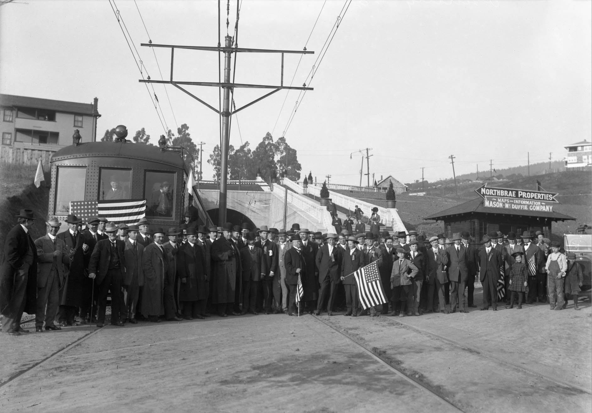 A celebration is in progress at the Sutter St. tunnel portal of the new extension from Berryman. The first train to pass through the tunnel is seen by the public on Dec. 22, 1911. Electric trains would begin running during the day from the Oakland Pier to Berryman the next day, and full service to Thousand Oaks was to begin on the 31st according to Robert Ford’s “Red Trains in the East Bay”, Interurbans, 1977.