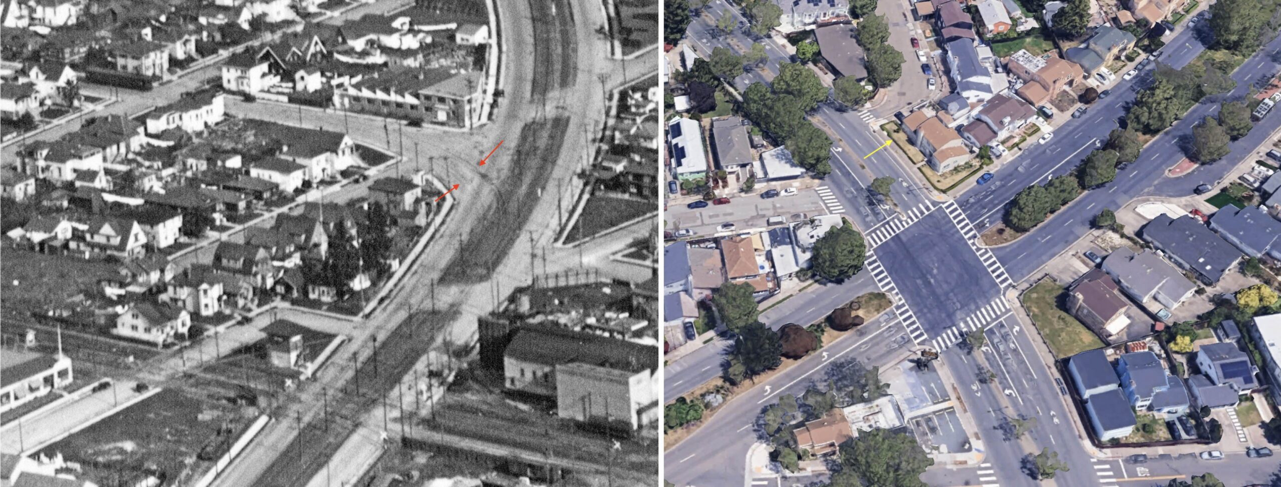 Lagging a couple weeks behind the opening of the extension of the Shattuck Ave. line was the opening of the California St. line. Very few images of the construction of this line were found, so these two aerials are included here to document where the line began on its out-bound trips from the Oakland Pier. The northeast aerial on the left ca. mid-1920s shows the two tracks, red arrows, emanating from the mainline on Stanford Ave. onto California St. On the right, a similar view from 2026 showing that the redesign of Market St. ca. 1950 that added a house, yellow arrow, where the track takeoffs had been previously located.