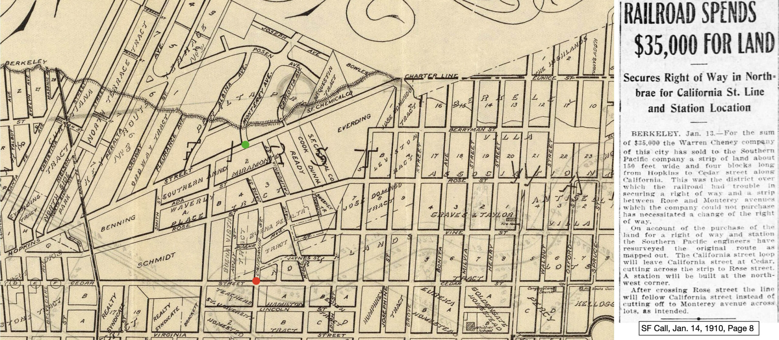 As the article on the right explains, the SP was unable to secure a right-of-way, ROW, between Cedar St. and Hopkins St., indicated by the colored circles on the map from ca. 1910, but were able to obtain a parallel route from Warren Cheney. Appreciation to Daniela Thompson for finding this article, which, it turns out, was part of the basis of a historical account of Cheney and his wife May that she authored. A very interesting story to read about two influential Berkeley residents who lived on the UC Berkeley campus and the final destinations of houses they owned. Click here for the article.