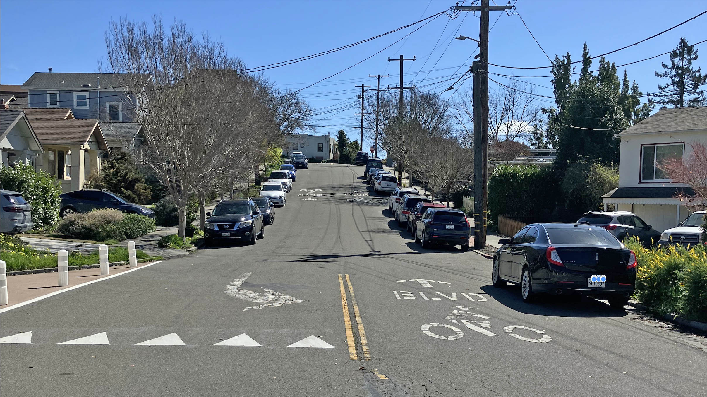The description of the ROW the SP obtained to complete the California St. line left out one very important characteristic, that is, the relatively steep grade between Rose St. and Ada St. as shown in this south view up California St. from Ada St. in 2026. You may recall in the previous update, the Key had to tackle this grade, which they did by cutting across it at a 45 degree gentle slope from Sacramento St. and Rose St.