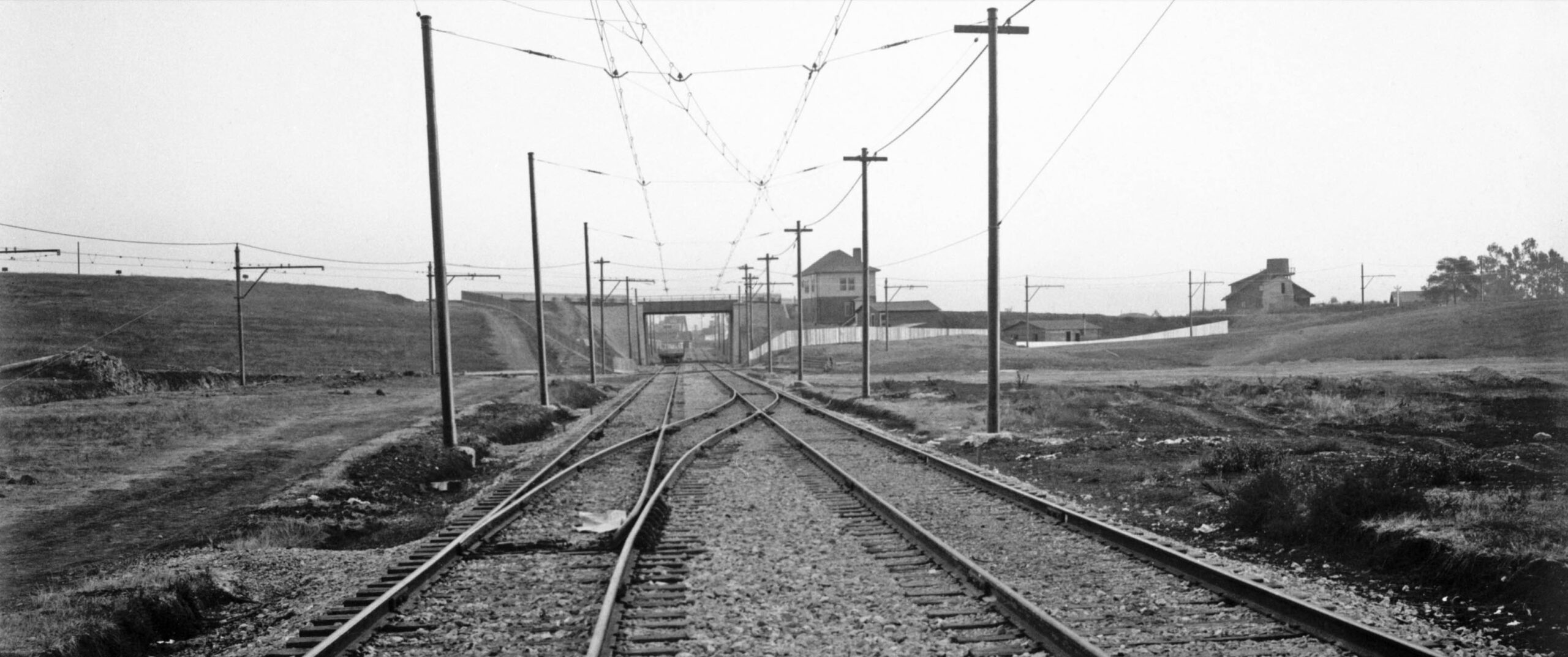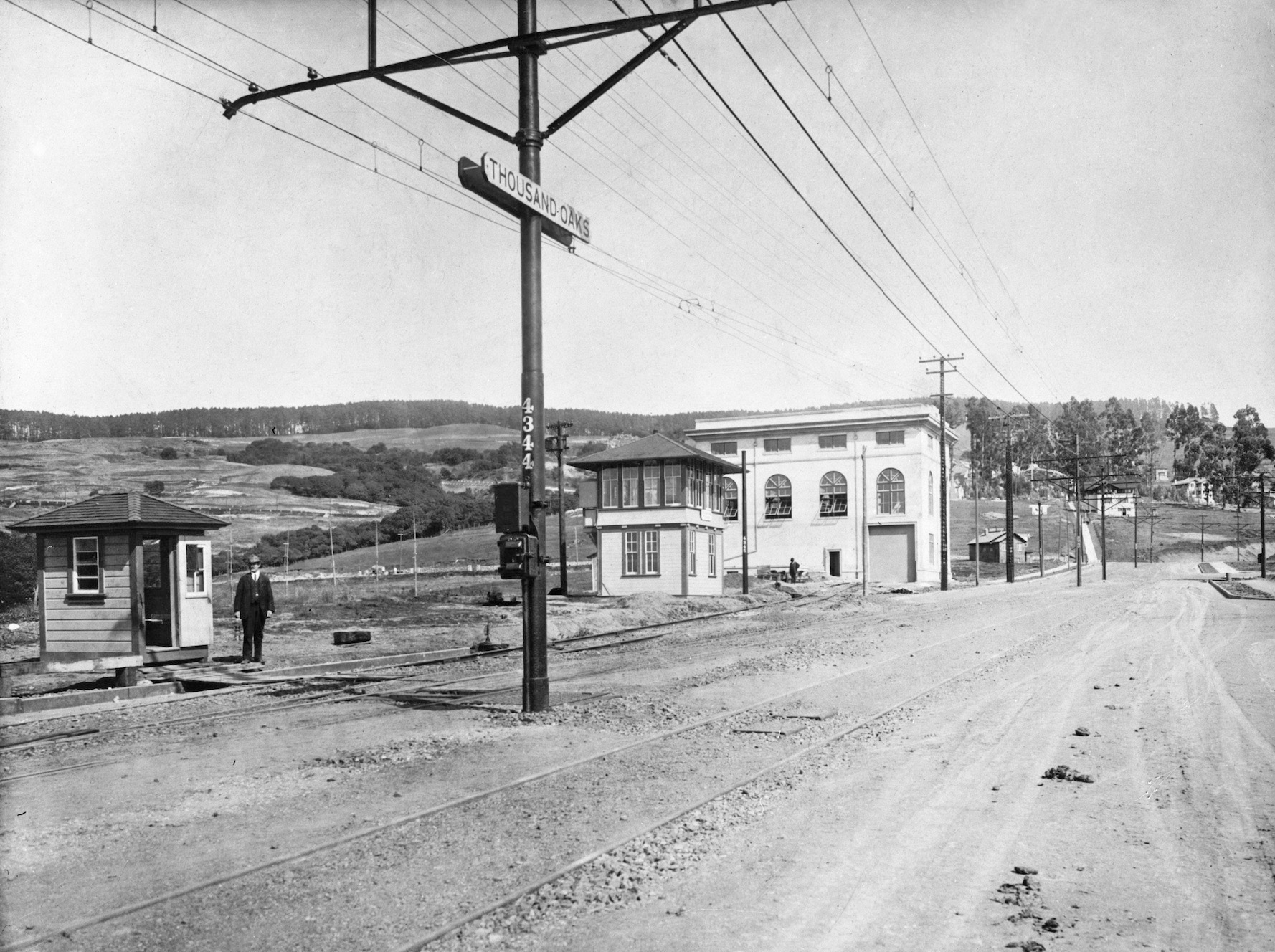 Ahead to Dec. 1, 1911, with electric operation to begin at the end of the month, three functions needed to be in place. In this east view, this consisted of the completed substation in the distance, the interlocking tower, and in the foreground, the switch tender’s shanty near Colusa Ave. Incidentally, note the steps of Indian Rock Path all the way in the distance, leading to Indian Rock Park on Indian Rock Ave.
