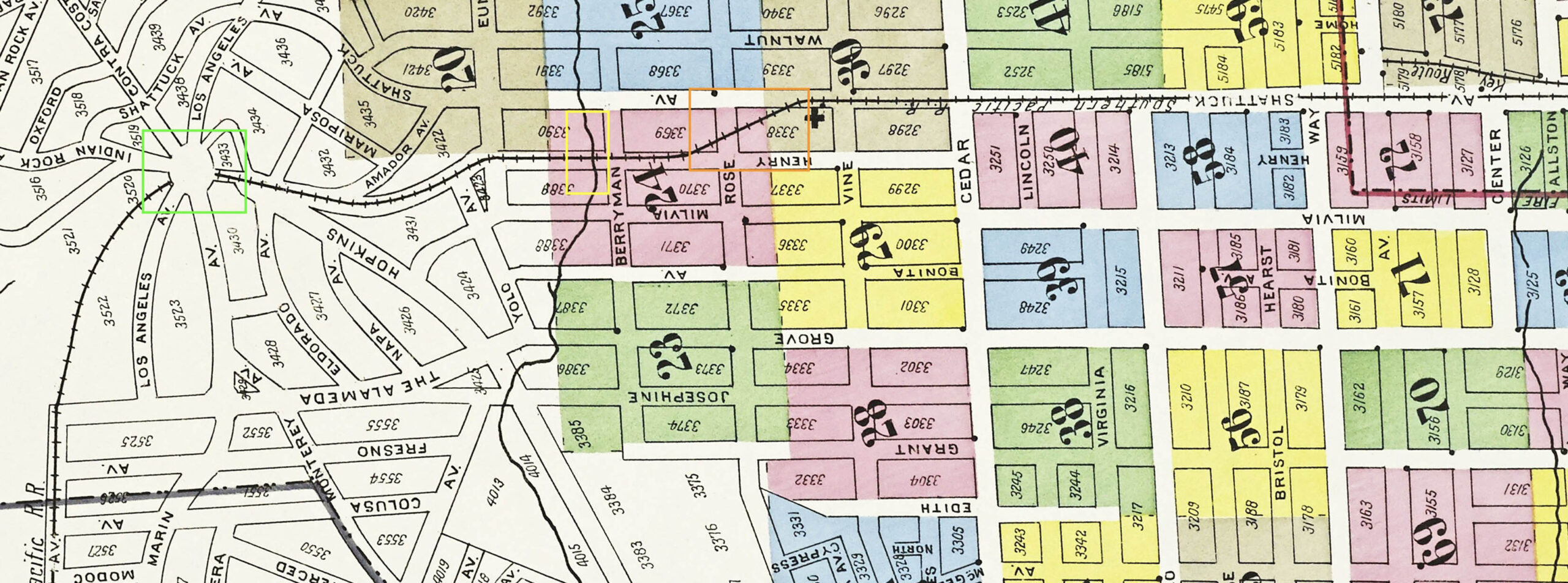 Lacking an aerial view from this time period, this mosaic from the 1911 Sanborn map flipped such that north is to the left margin indicates the new railway would cross over to Henry St., yellow box, cross Codornices Creek, orange box, and tunnel under the future Circle in Northbrae, green box, making the turn west to head down Solano Ave. to the Colusa Ave. stop the SP called Thousand Oaks. The shift to Henry St. follows the track noted in the previous panel.