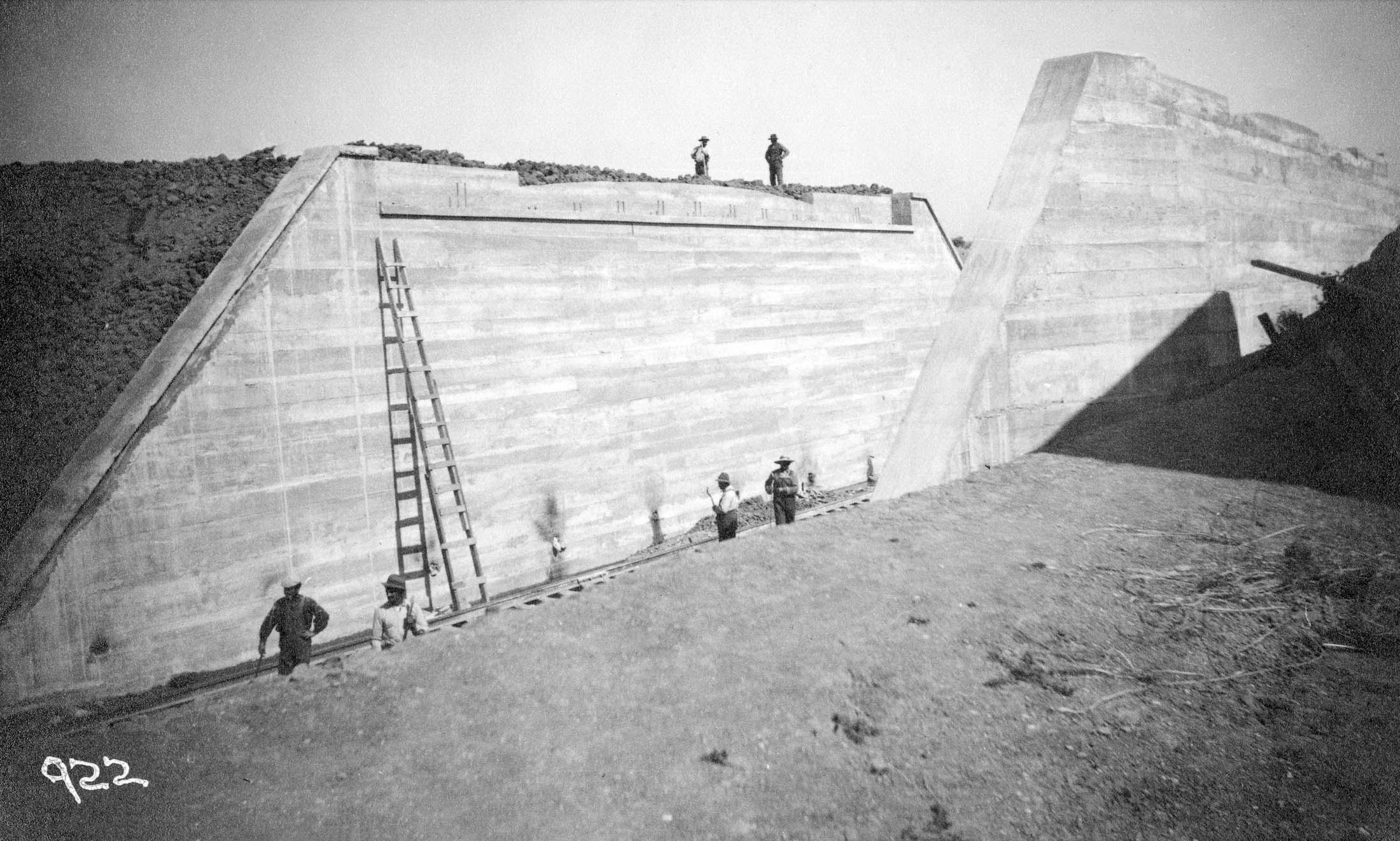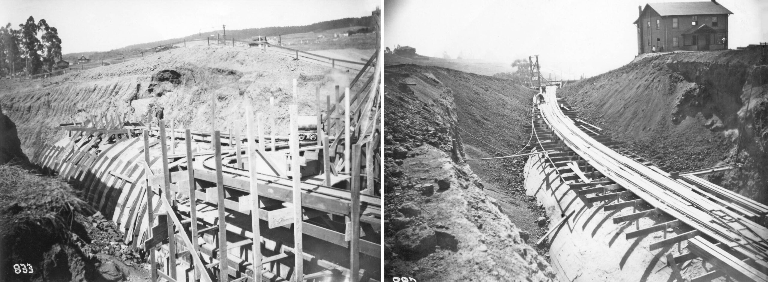 The north view on the left continues the sequence from Aug. 20, 1910 as concrete is ready to be added to the frame. Note the narrow gauge track on top of the supports used to transport materials. On the right, a west view of the tunnel wall now formed by concrete ready to be covered in dirt on Oct 10, 1910.