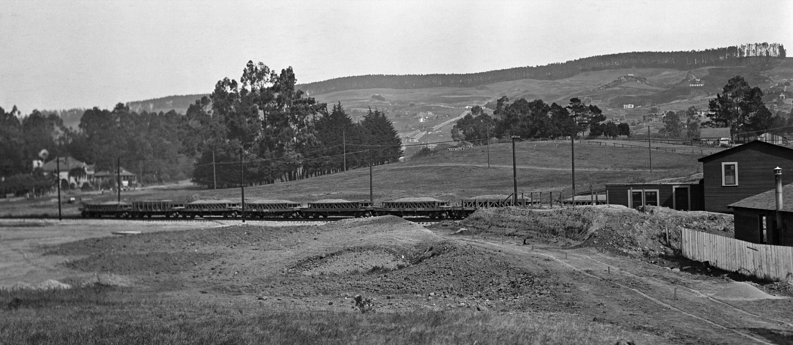 From the Sutter St. side, a northeast view depicts the eastern flank of the area as construction began in early 1910. The Oak tree is just short of the location of the future Del Norte St. The tree will be right beside the SP Northbrae station shelter once it is constructed.