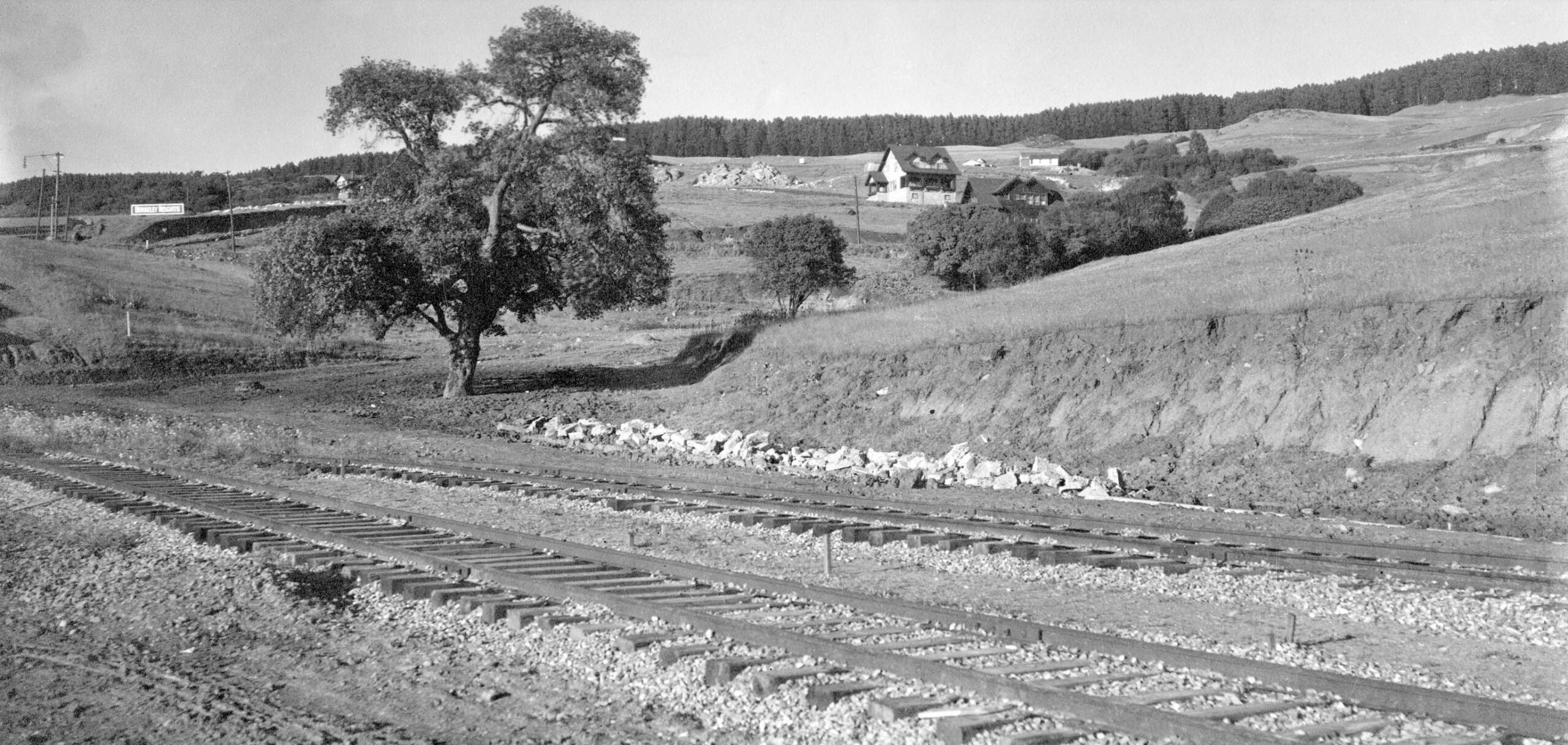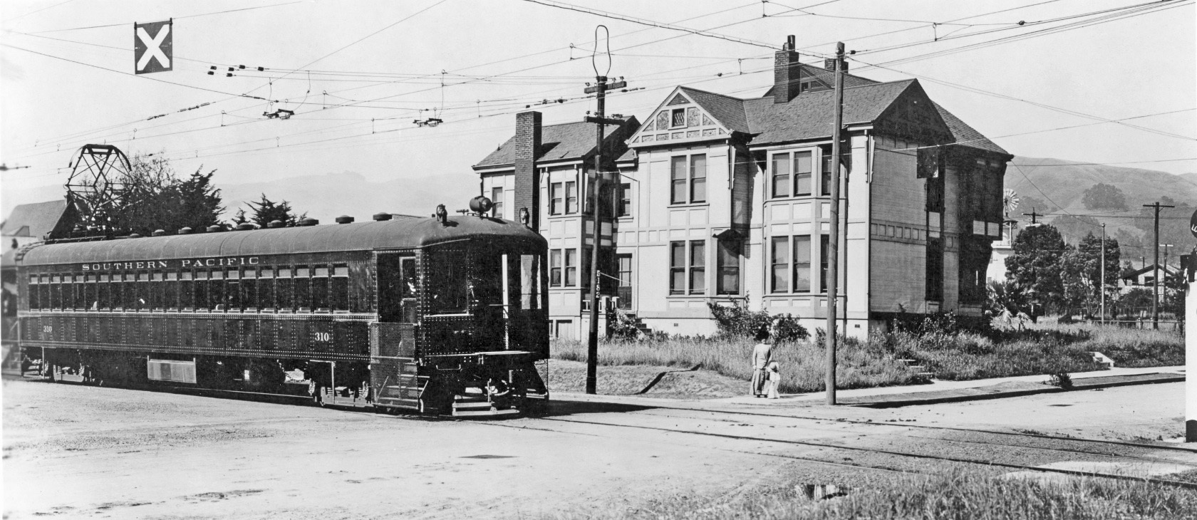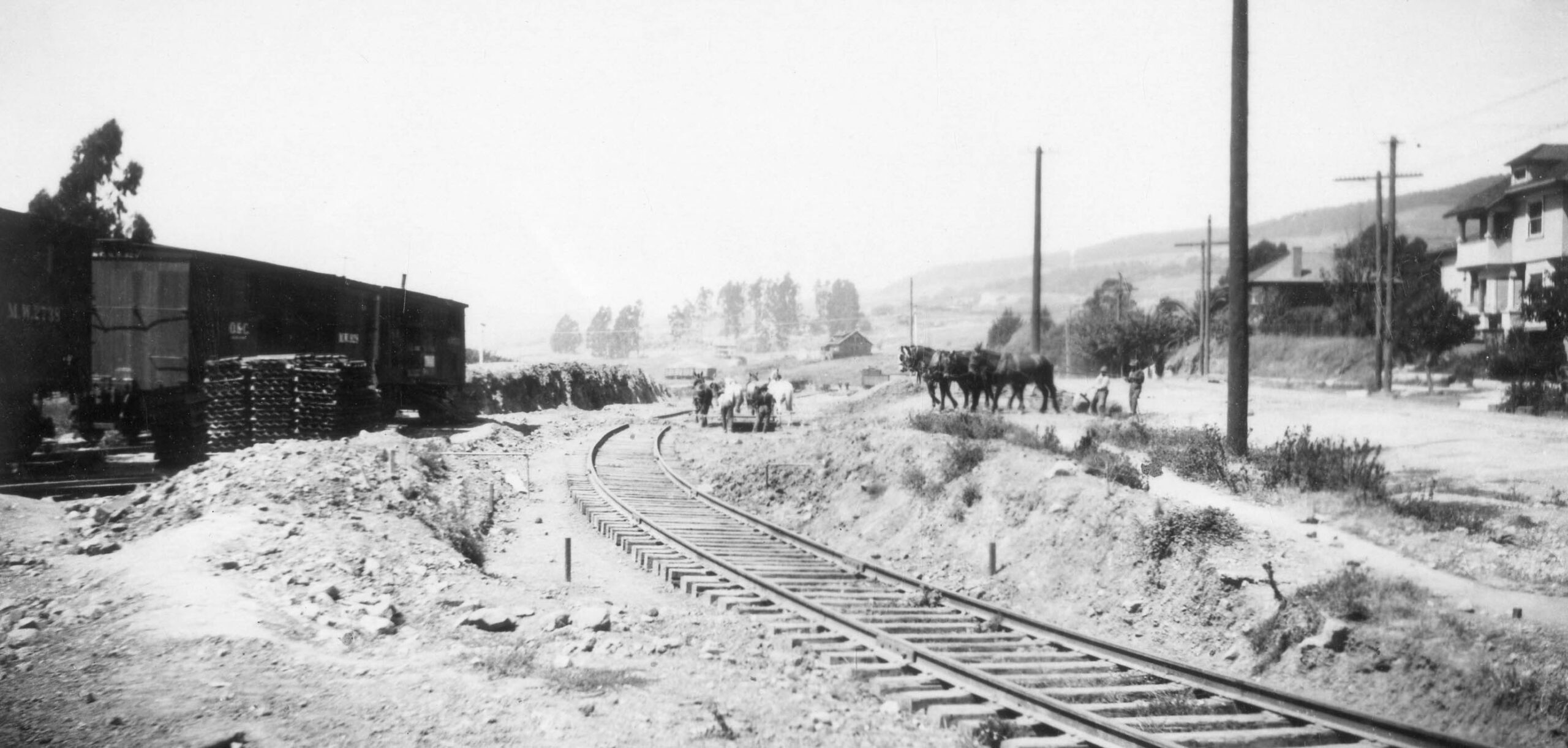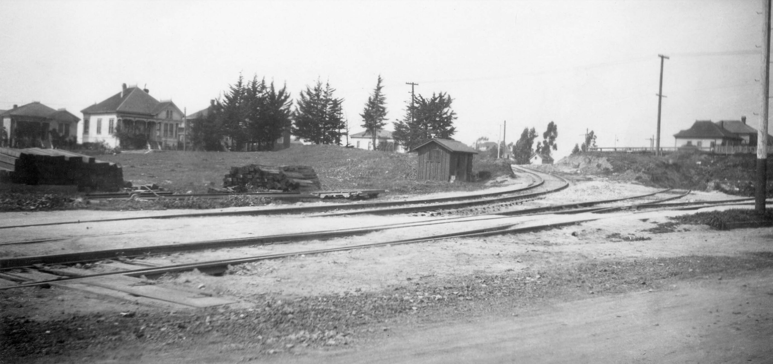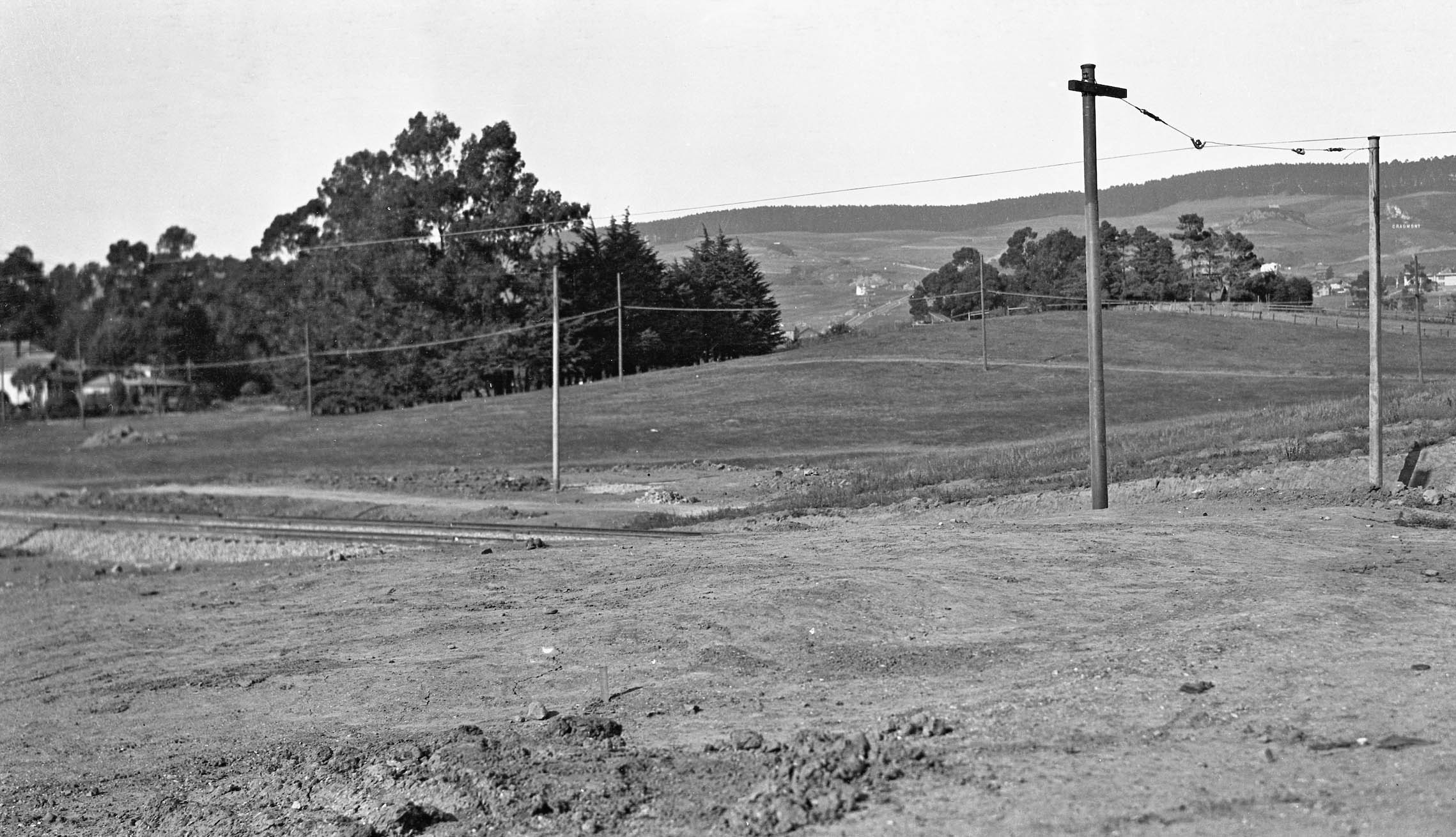 Moving closer to the future site of the crossing in a similar timeframe from the previous image, the double track of the SP line is supported with very preliminary poles carrying only a single overhead wire. The shiny pole in the center of the image is most likely for the Key Northbrae line, the pole being to the east of what is at this time a dirt path. That would position the photographer very close to Ada St. in terms of present day streets.